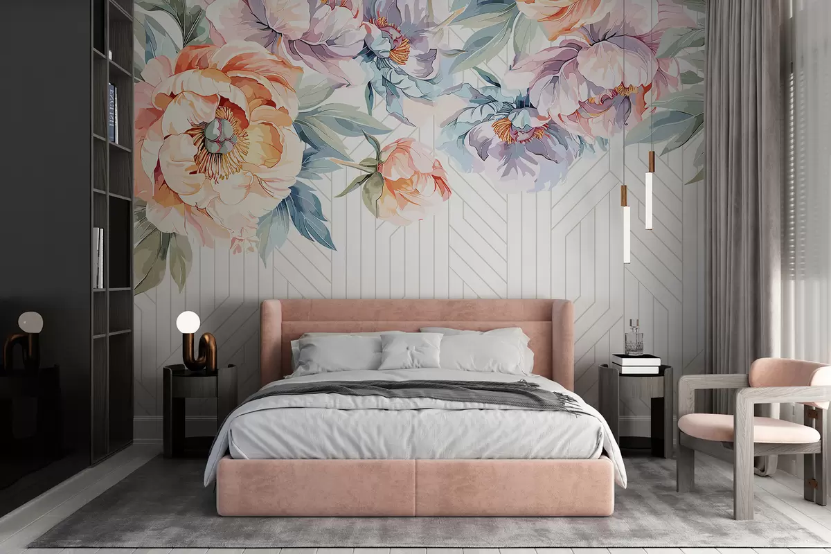 Stenske poslikave Živahne breskve in roza abstraktne potonike z zelenimi listi na ozadju z belim in sivim vzorcem Št. w08183