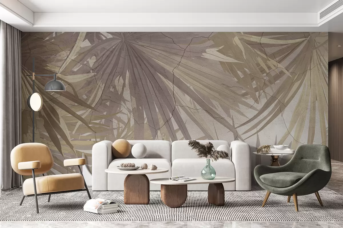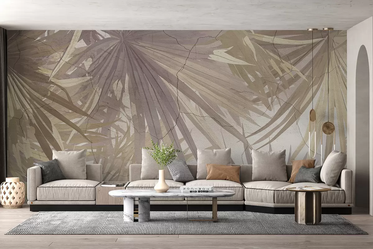 Stenske poslikave Bujno tropsko listje z velikimi rjavimi palmovimi listi na mehkem meglenem ozadju Št. w08187v1