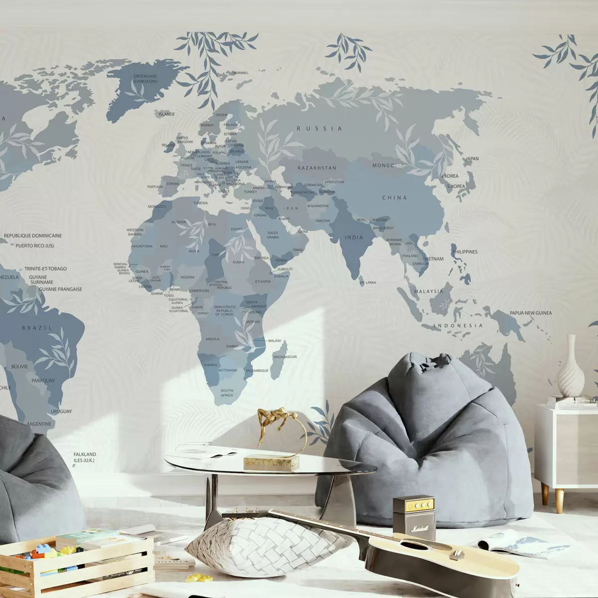 Stenske poslikave Eleganten zemljevid sveta z listi in rastlinami modre barve Št. w08211v4