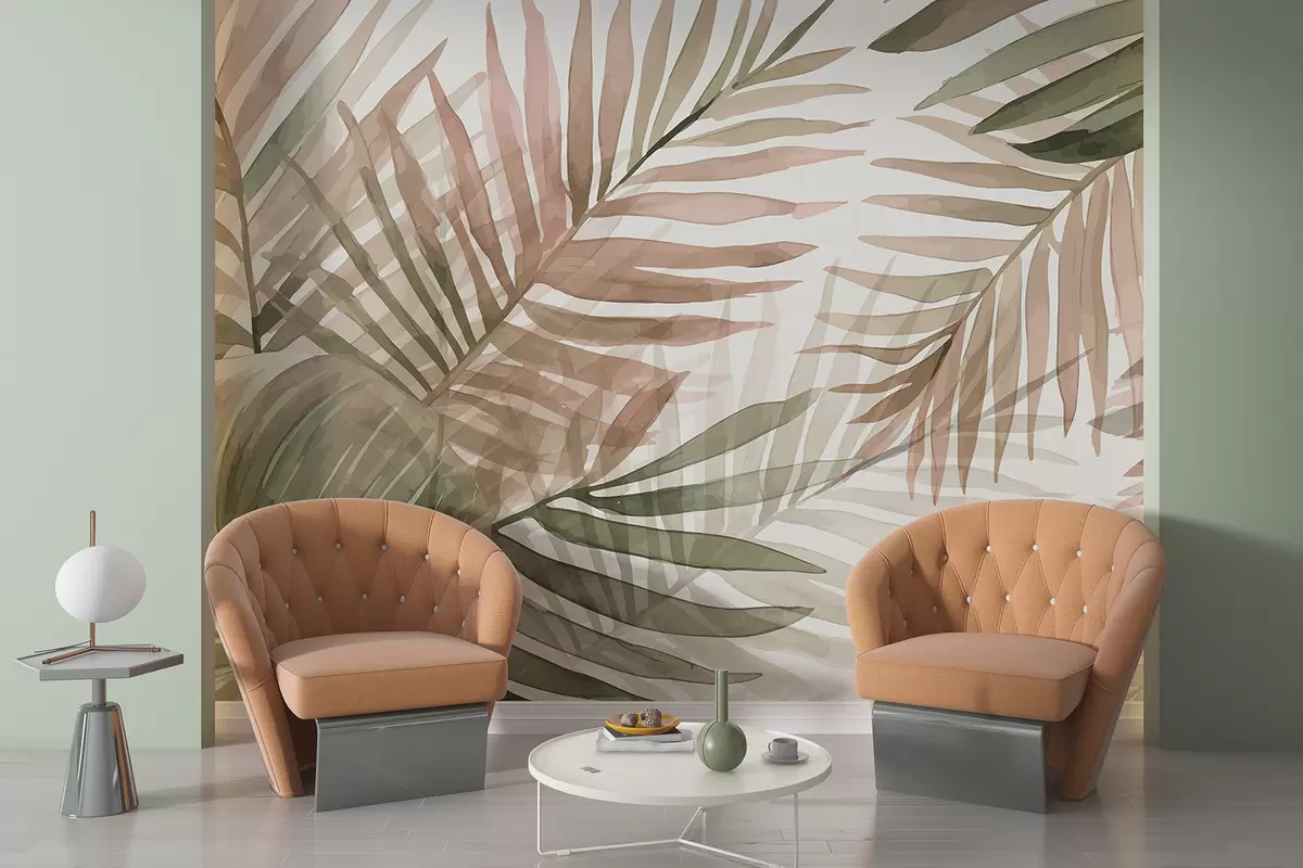 Stenske poslikave Palmovi akvarelni listi v različnih odtenkih zelene in rožnate barve na svetlem ozadju Št. w08218
