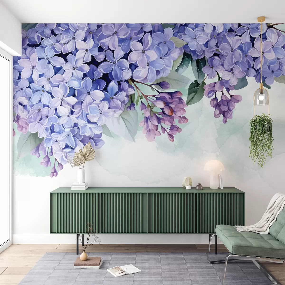 Stenske poslikave Živahni vijolični cvetovi hortenzije z zelenimi listi zapolnjujejo okvir na mehkem, zamegljenem ozadju Št. w08223