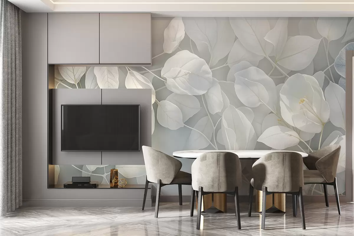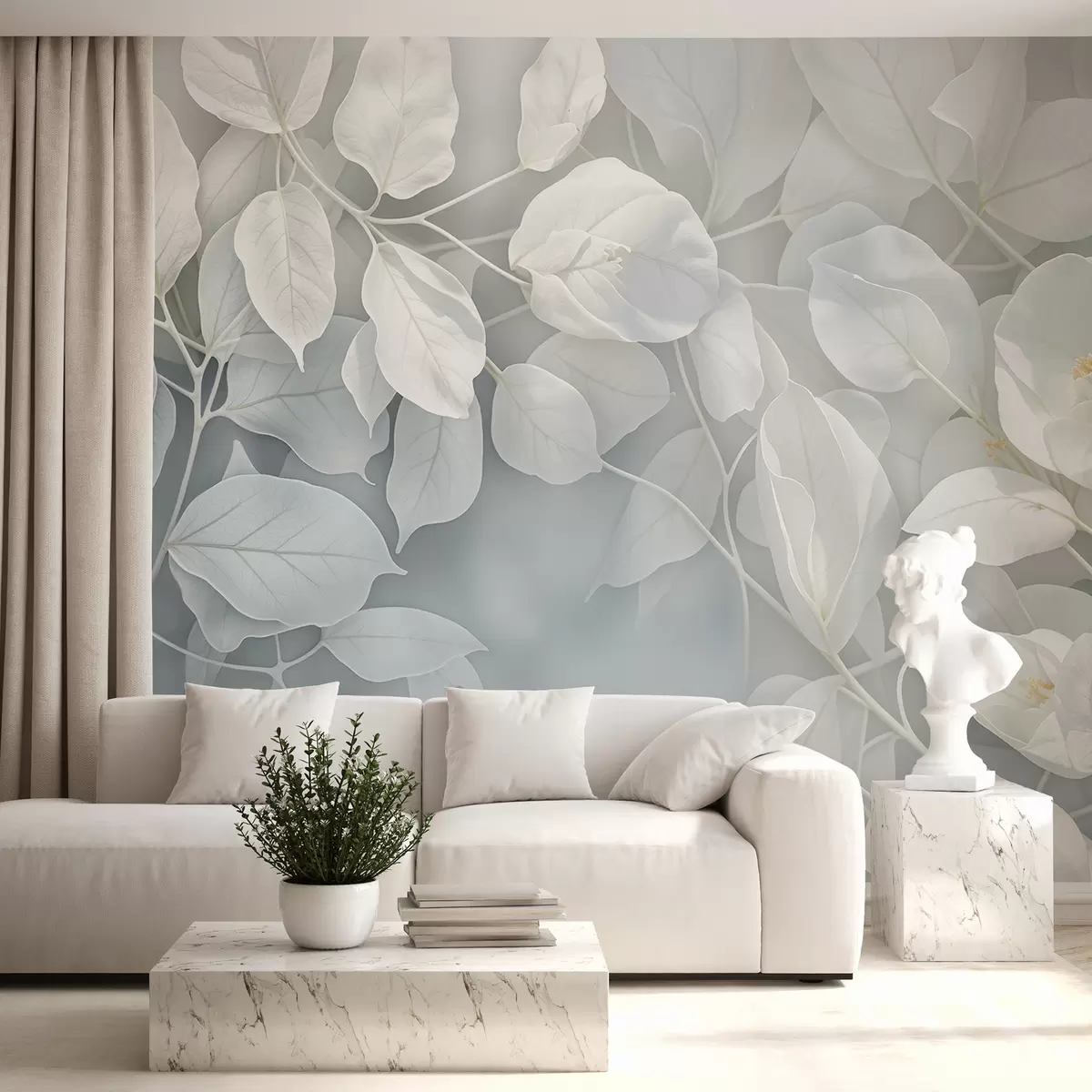 Stenske poslikave Mehki, nežni beli cvetovi s sivo-zelenimi listi na zamegljenem ozadju ustvarjajo mirno vzdušje Št. w08232