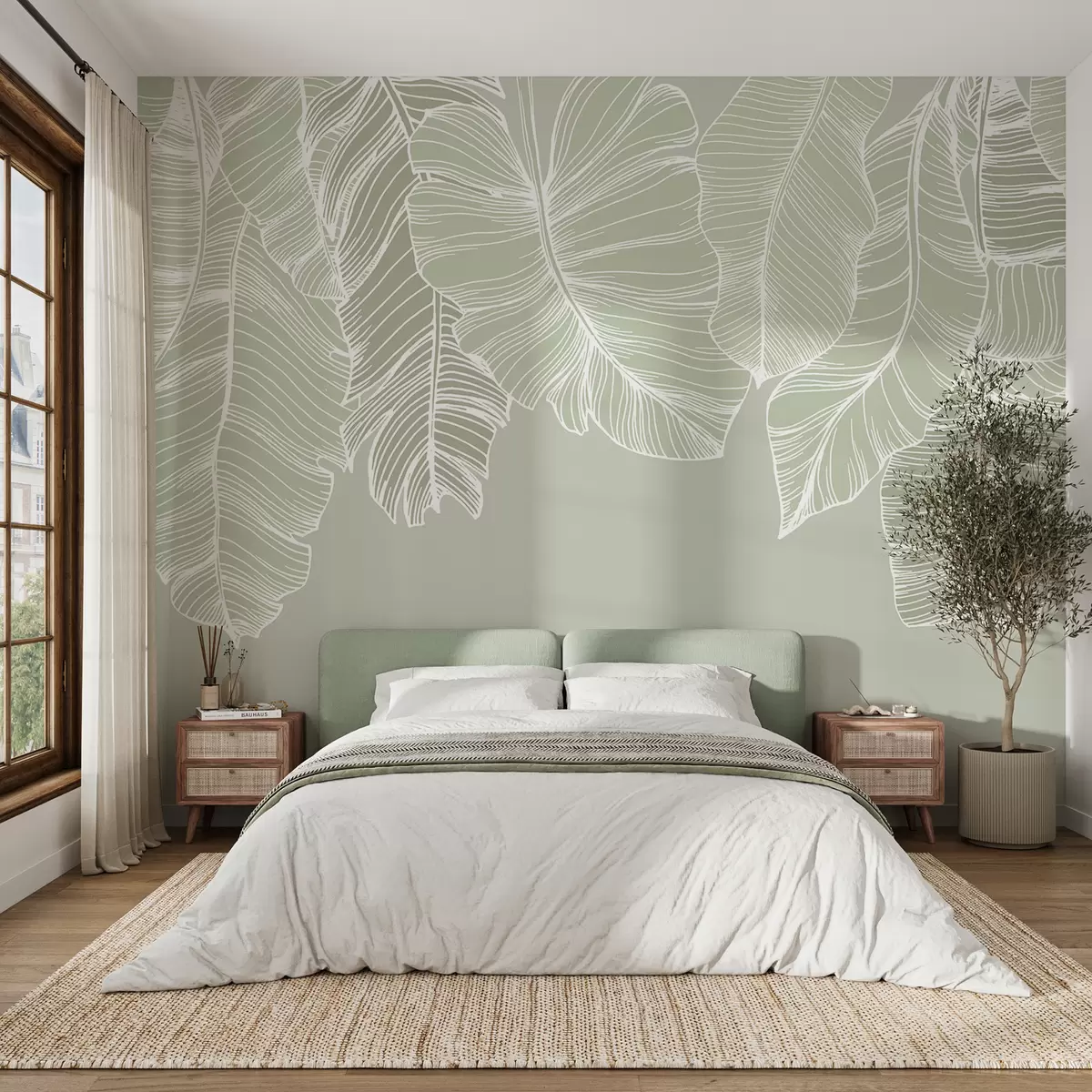 Stenske poslikave Beli tropski cvetlični listi s svetlo zelenim ozadjem, minimalistično linijsko oblikovanje Št. w08235v1