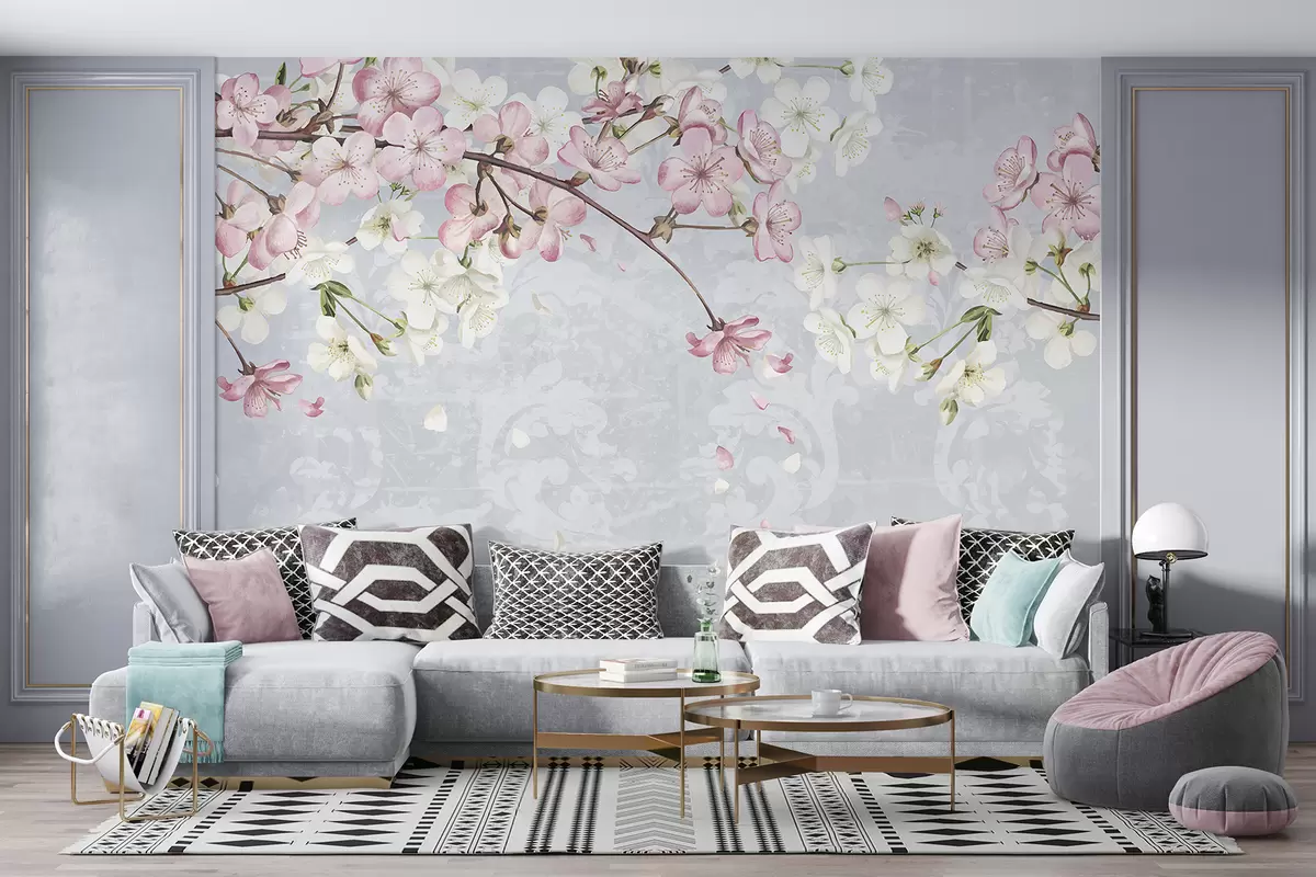 Stenske poslikave Roza in beli cvetovi češnje v polnem razcvetu z mehkimi cvetnimi lističi, ki padajo na teksturirano modro ozadje Št. w08254