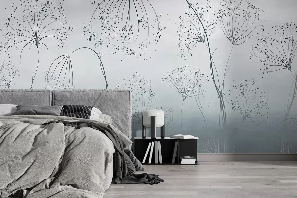 Stenske poslikave Modre visoke, košate rastline z nežnimi cvetovi v obliki dežnika ali semenskimi glavami v meglenem, atmosferskem okolju Št. w08258v1