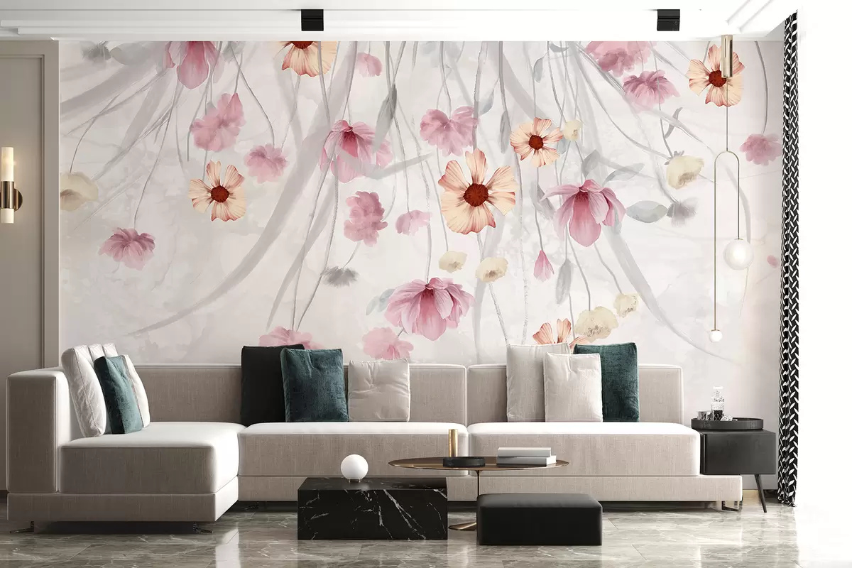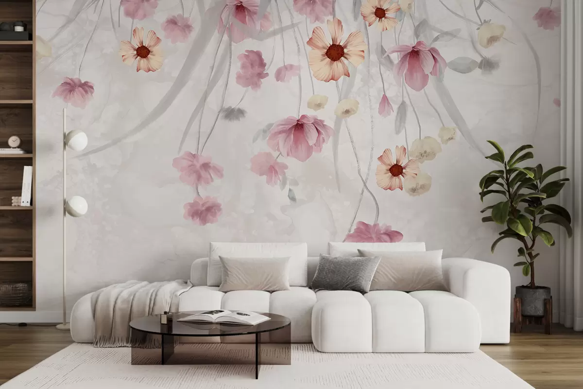Stenske poslikave Nežno pastelno rožnato in rumeno cvetje z rumenimi središči, ki se kaskadno spušča po mehkem, zamegljenem ozadju Št. w08261v1