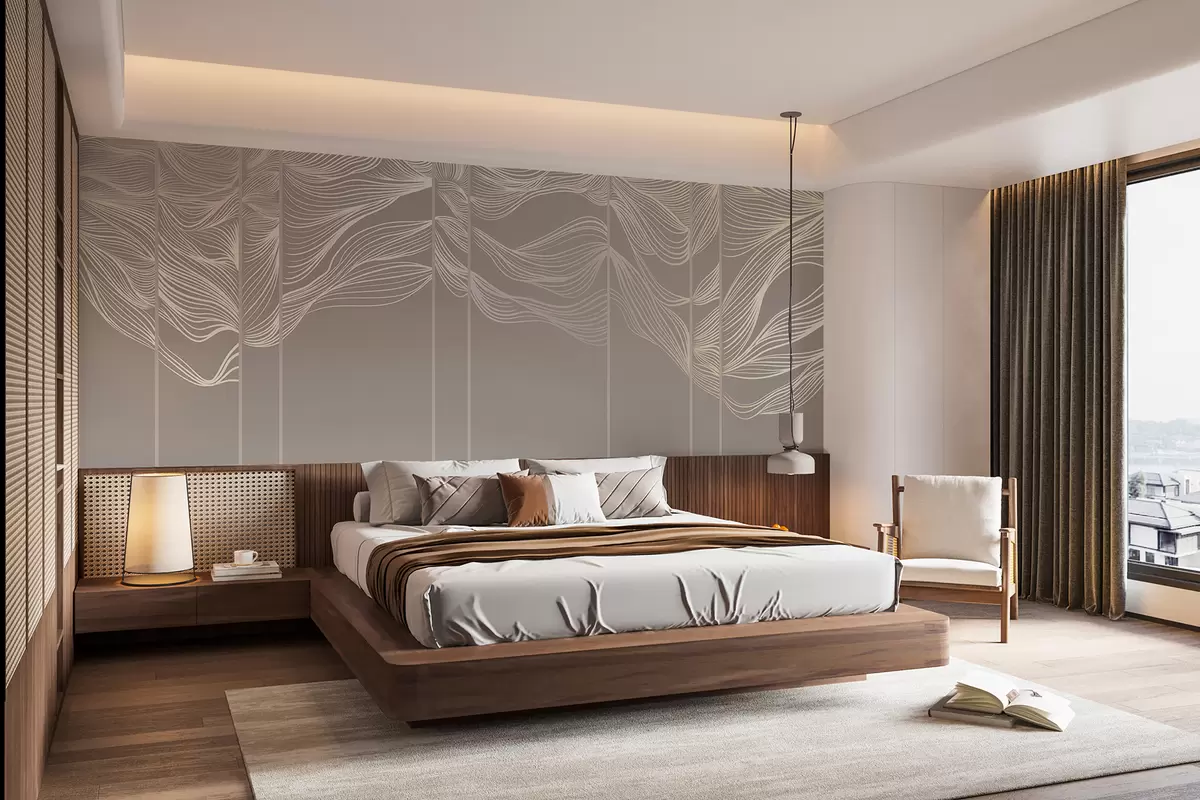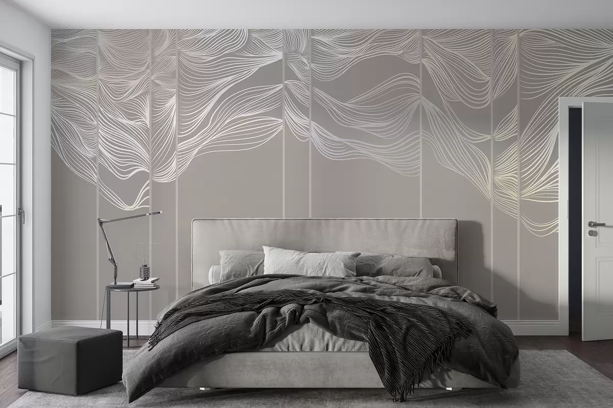 Stenske poslikave Tekoči beli abstraktni linijski valovi na svetlo rjavem ozadju Št. w08263