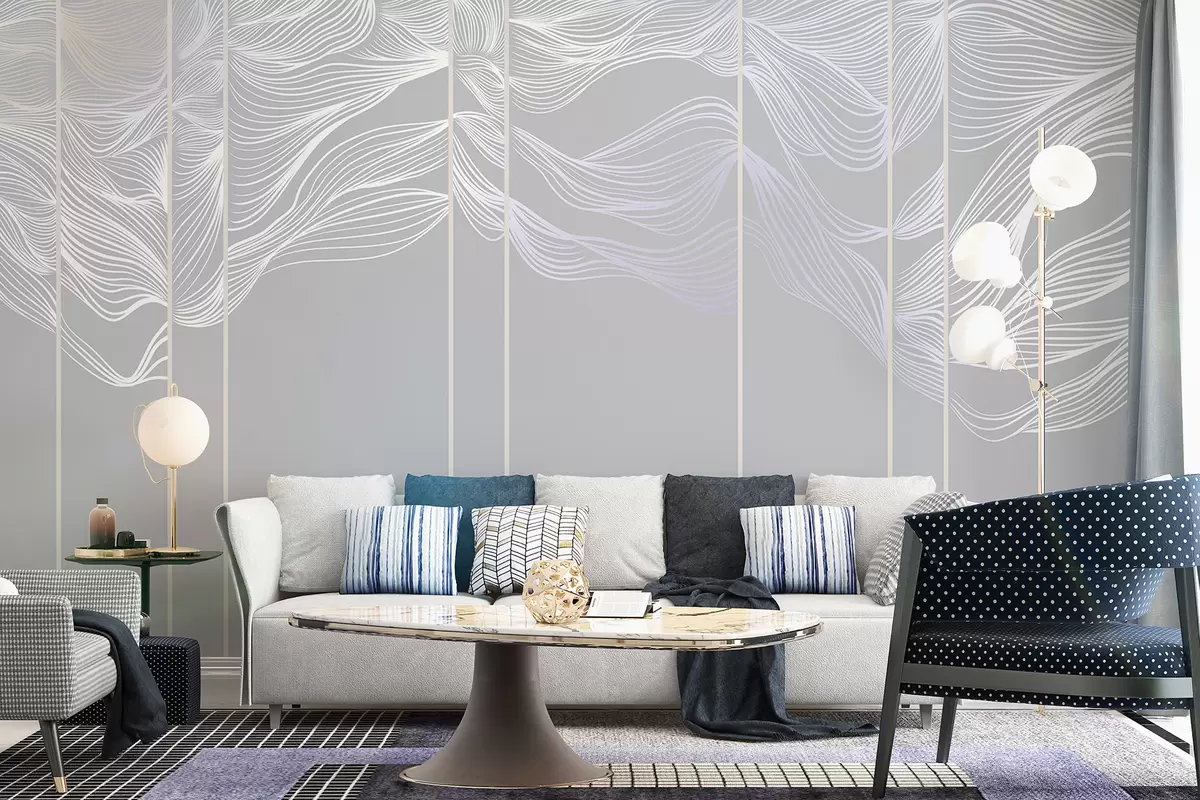 Stenske poslikave Tekoči beli abstraktni linijski valovi na svetlo sivem ozadju Št. w08263v1