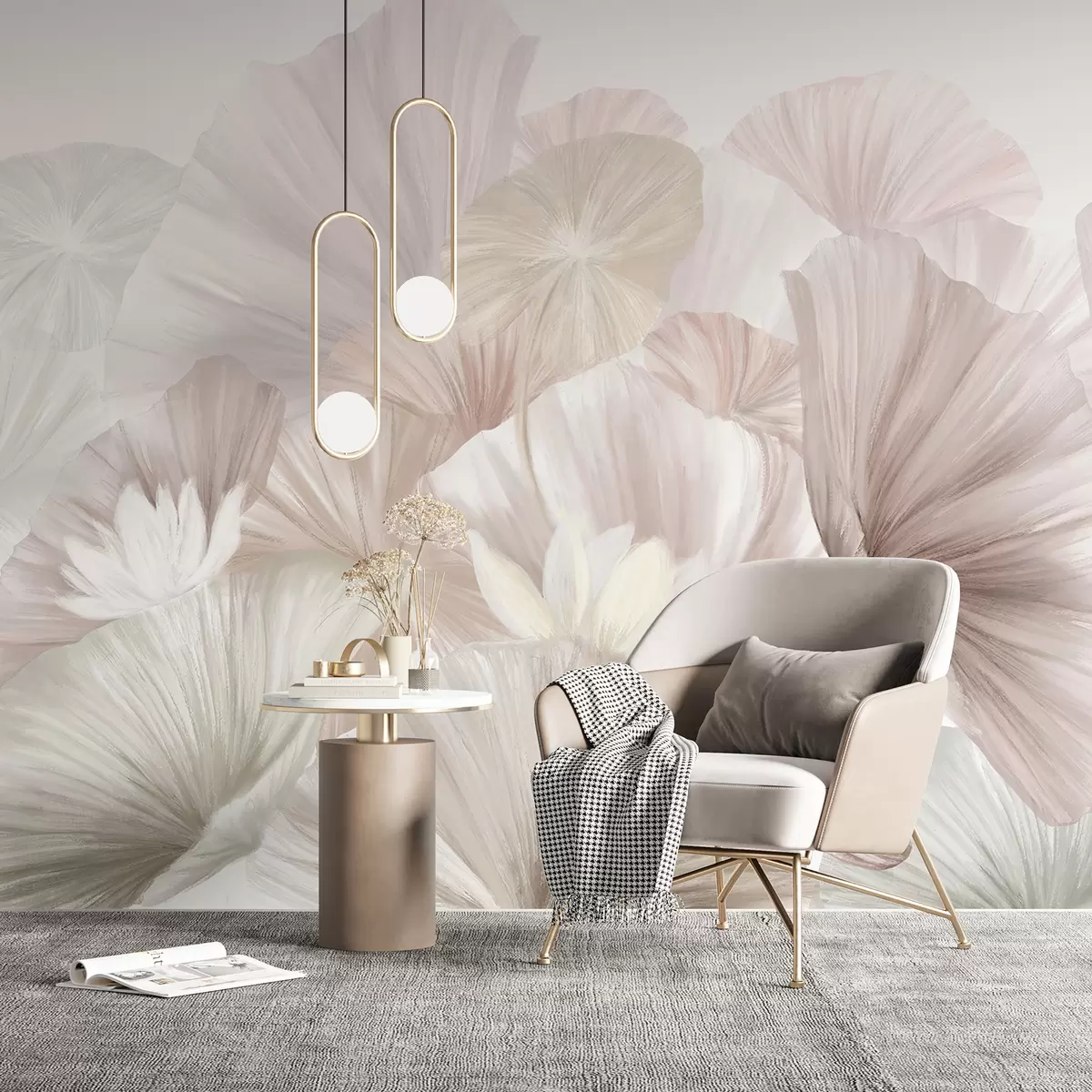 Stenske poslikave Nežni roza lotosovi listi z belimi cvetovi z mehkimi, pernato oblikovanimi cvetnimi listi, razporejenimi v naravni umetniški kompoziciji Št. w08265v1