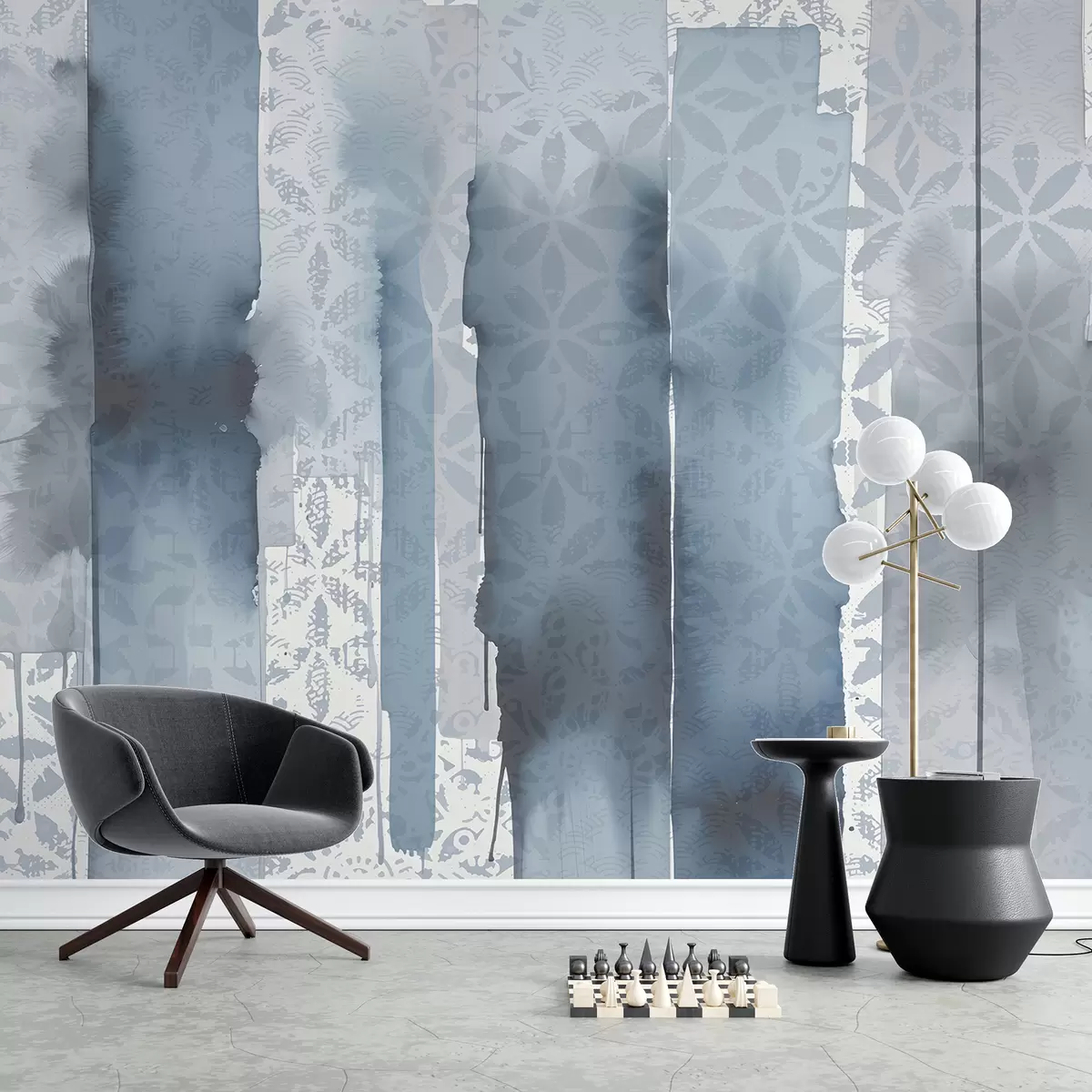 Stenske poslikave Akvarelni abstraktni tisk z velikimi modrimi potezami čopiča in vintage vzorcem Št. w08267
