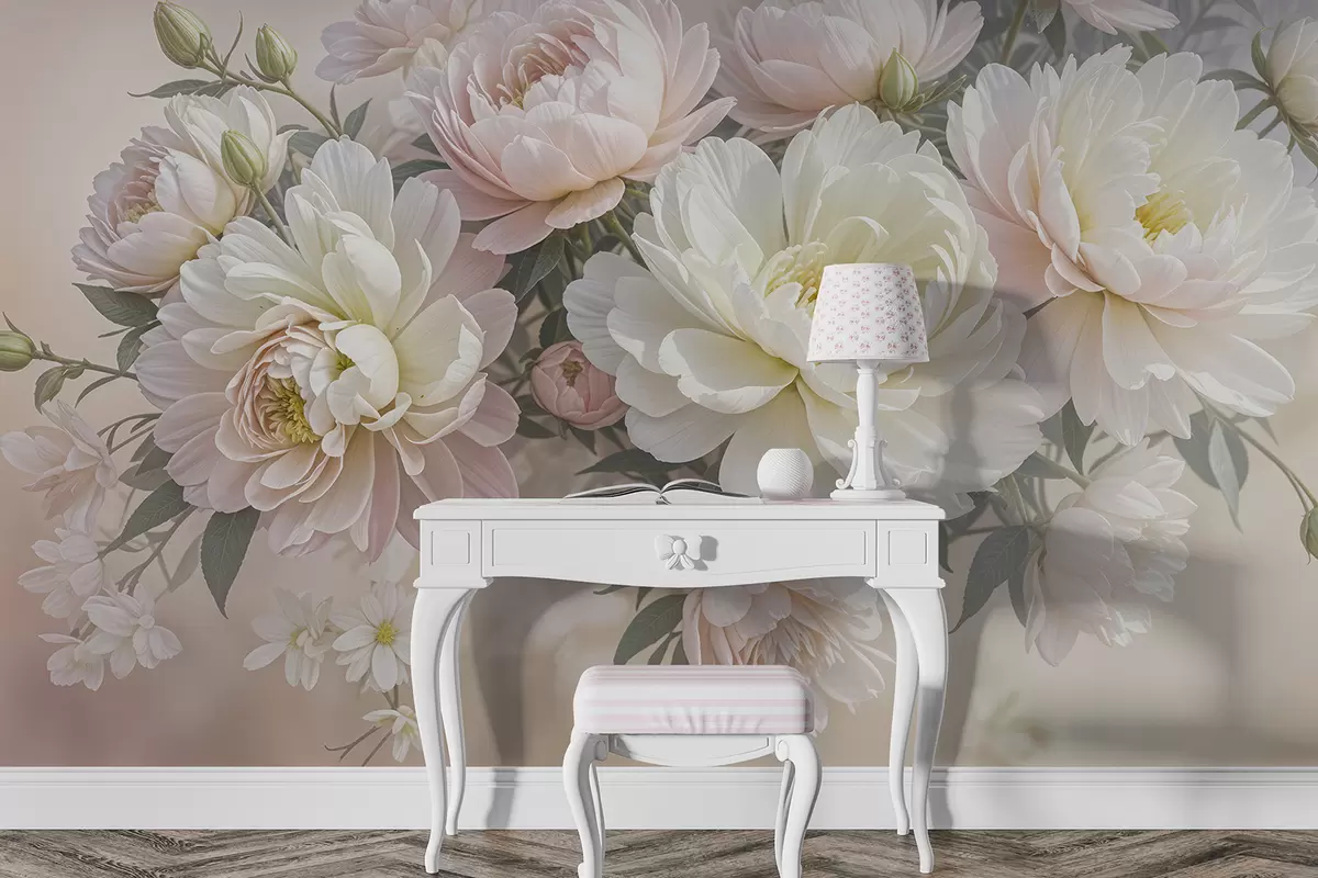 Stenske poslikave Šopek bujnih, pastelno obarvanih borovnic in drugega cvetja na mehkem, zamegljenem ozadju Št. w08276