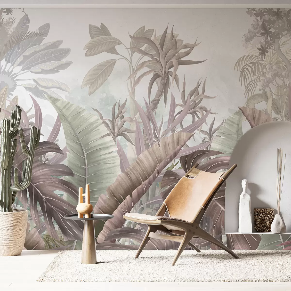 Stenske poslikave Tropska džungla z velikimi palmovimi listi in eksotičnimi rastlinami v sivih, belih in bež odtenkih Št. w08307