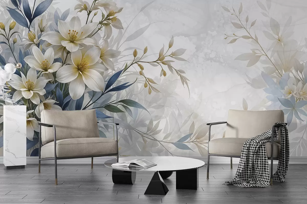 Stenske poslikave Beli, bež in modri cvetlični šopek z nežnimi listi na mehkem, zamegljenem ozadju Št. w08314