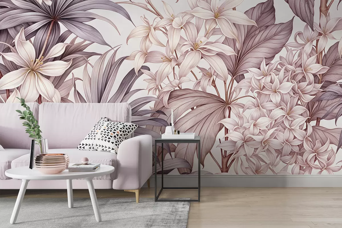 Stenske poslikave Tropski cvetlični tisk z velikimi belimi in svetlo rožnatimi cvetovi, bordo listi in nevtralnim ozadjem Št. w08318v1