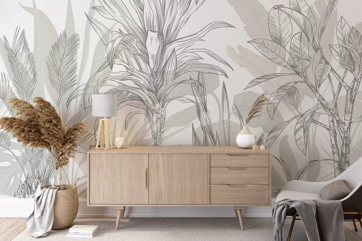 Stenske poslikave Tropske grafične rastline z velikimi, bujnimi listi in cvetovi v sivih in belih odtenkih z zelenimi cvetličnimi silhuetami Št. w08327