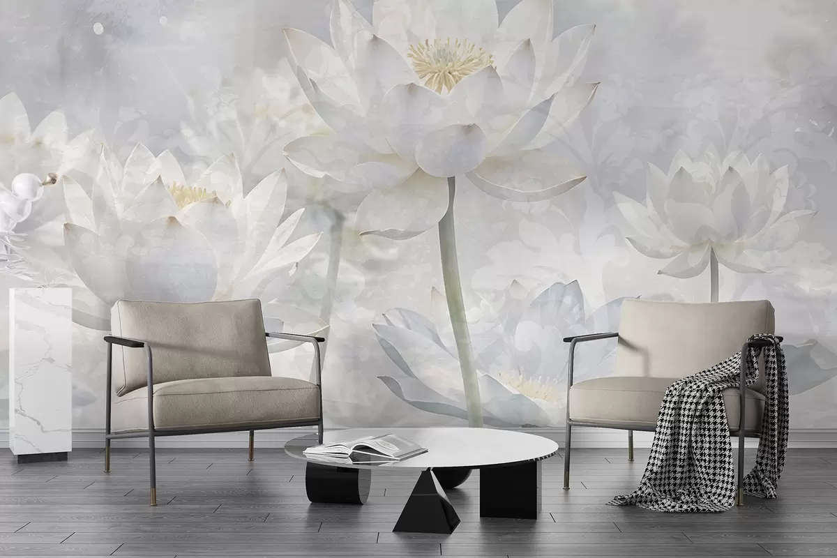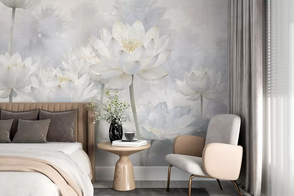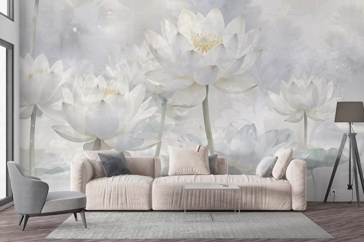 Stenske poslikave Beli lotosovi cvetovi v meglenem, eteričnem ozadju abstraktne pastelne pokrajine Št. w08328