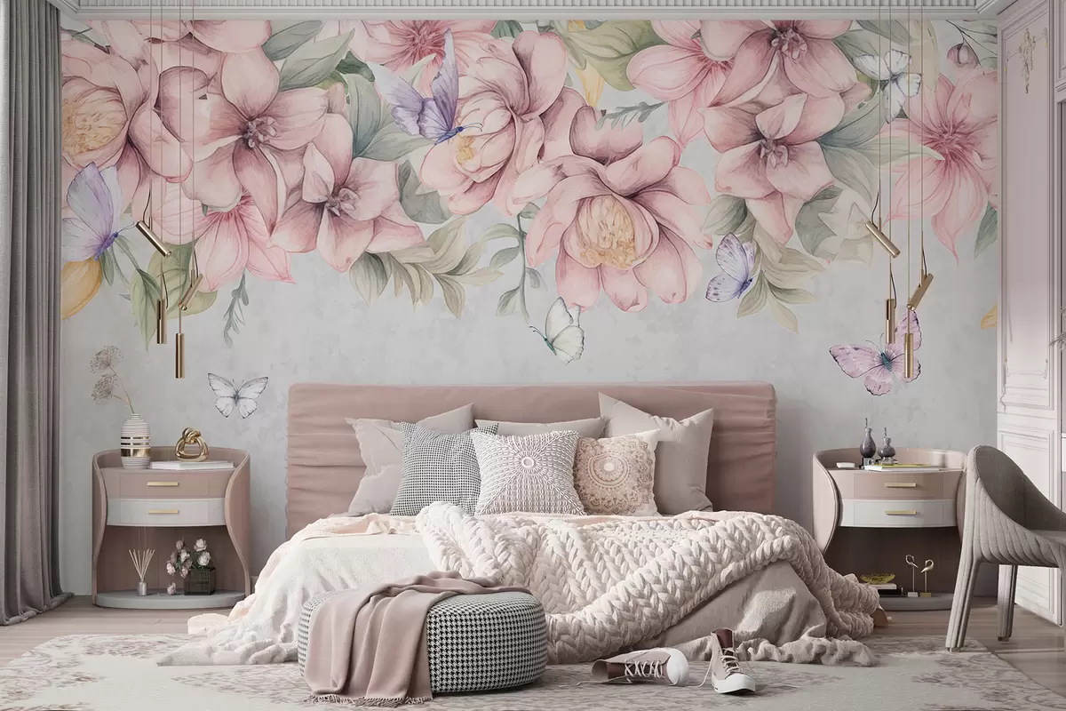 Stenske poslikave Mehko roza in belo cvetje z nežnimi cvetovi in listi na teksturiranem sivem ozadju Št. w08331