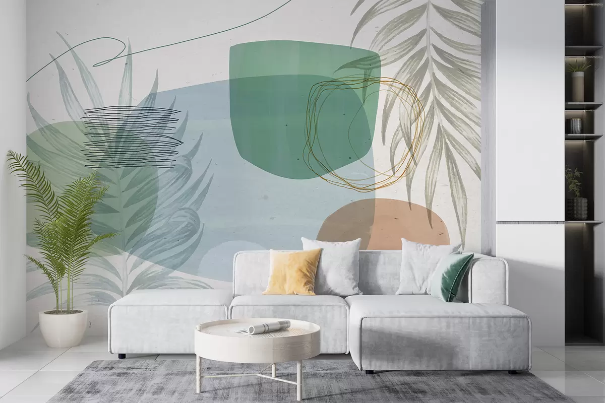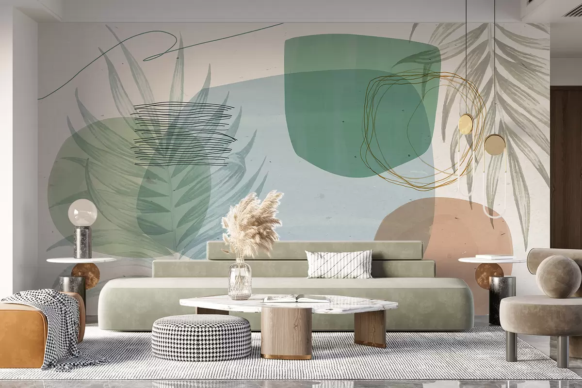 Stenske poslikave Abstraktna teksturirana kompozicija z organskimi oblikami in tropskimi listi v umirjenih pastelnih barvah Št. w08335