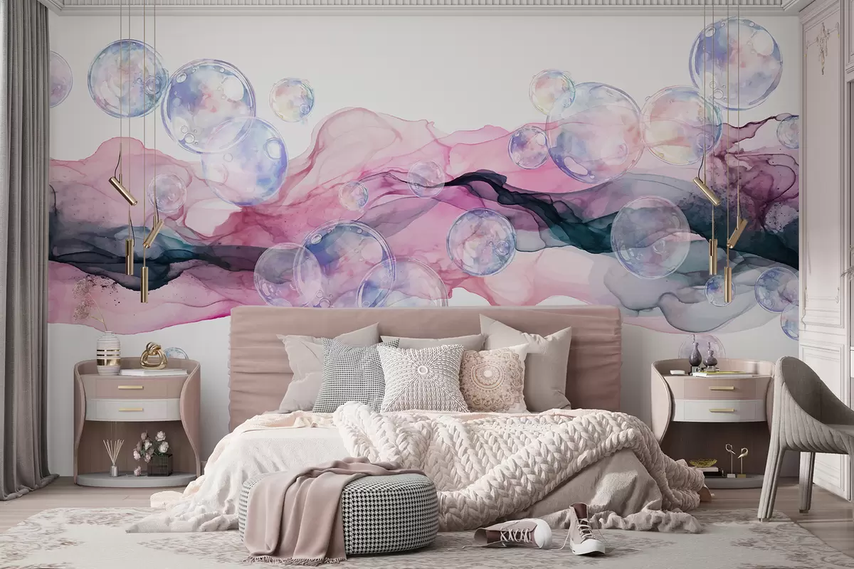 Stenske poslikave Barvite abstraktne tekoče oblike z mehurčki, vrtinci rožnatih, modrih in vijoličnih odtenkov na belem ozadju Št. w08337