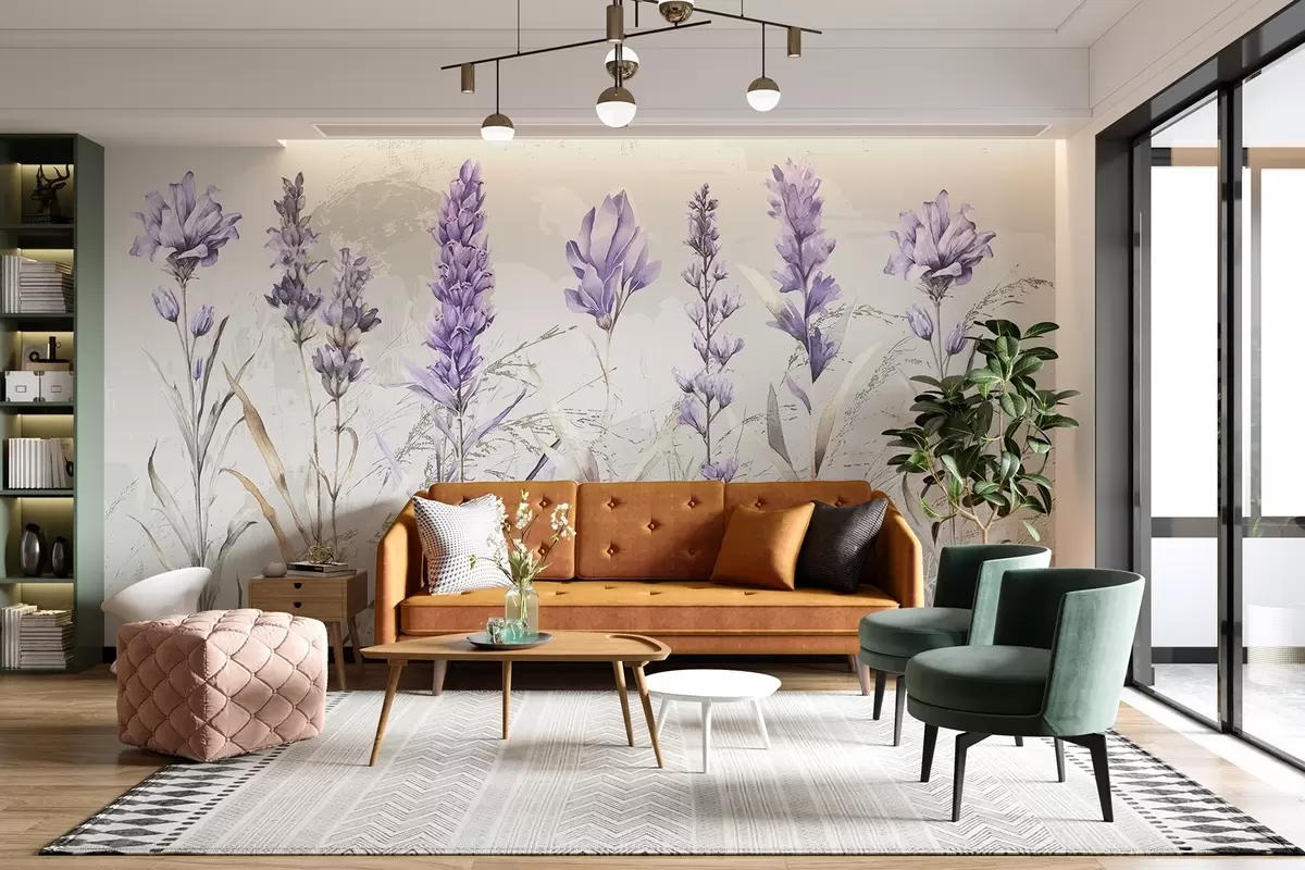 Stenske poslikave Polje vijoličnih akvarelnih cvetov sivke z mehkim, zamegljenim teksturiranim bež ozadjem Št. w08346