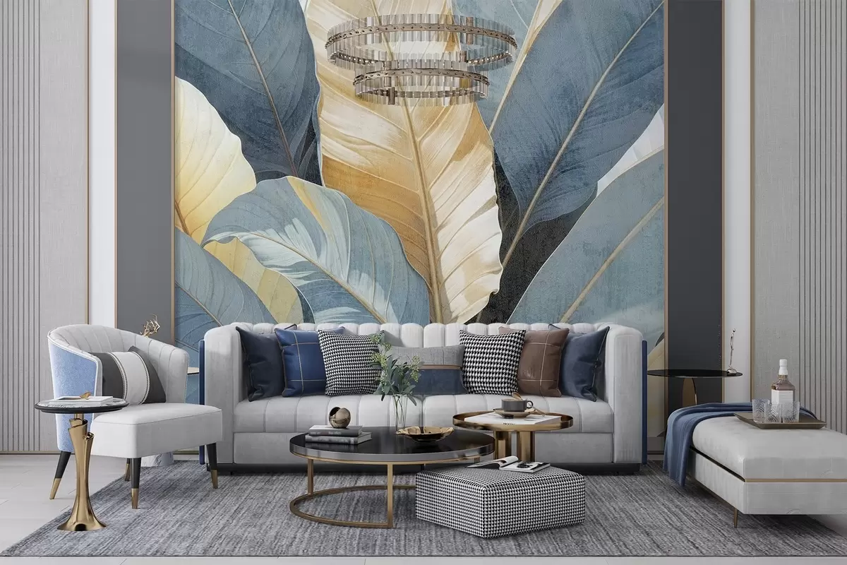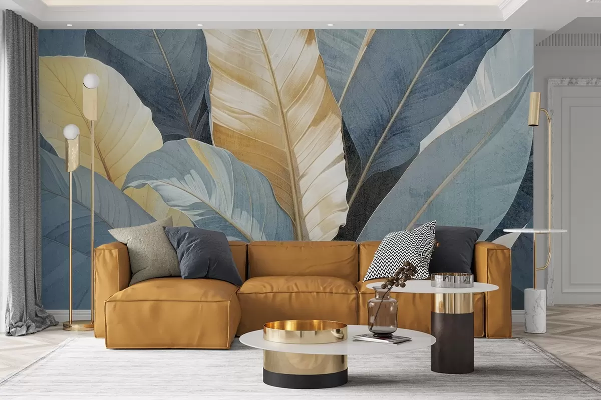 Stenske poslikave Pogled od blizu na velike bujne, teksturirane okrasne tropske liste v modrih, zelenih in rumenih odtenkih Št. w08373