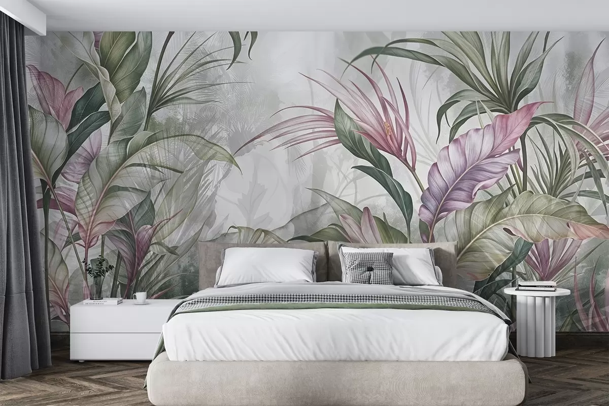 Stenske poslikave Tropska džungla z velikimi zelenimi listi in rožnatimi cvetovi proteje z zamegljenim teksturiranim ozadjem Št. w08375