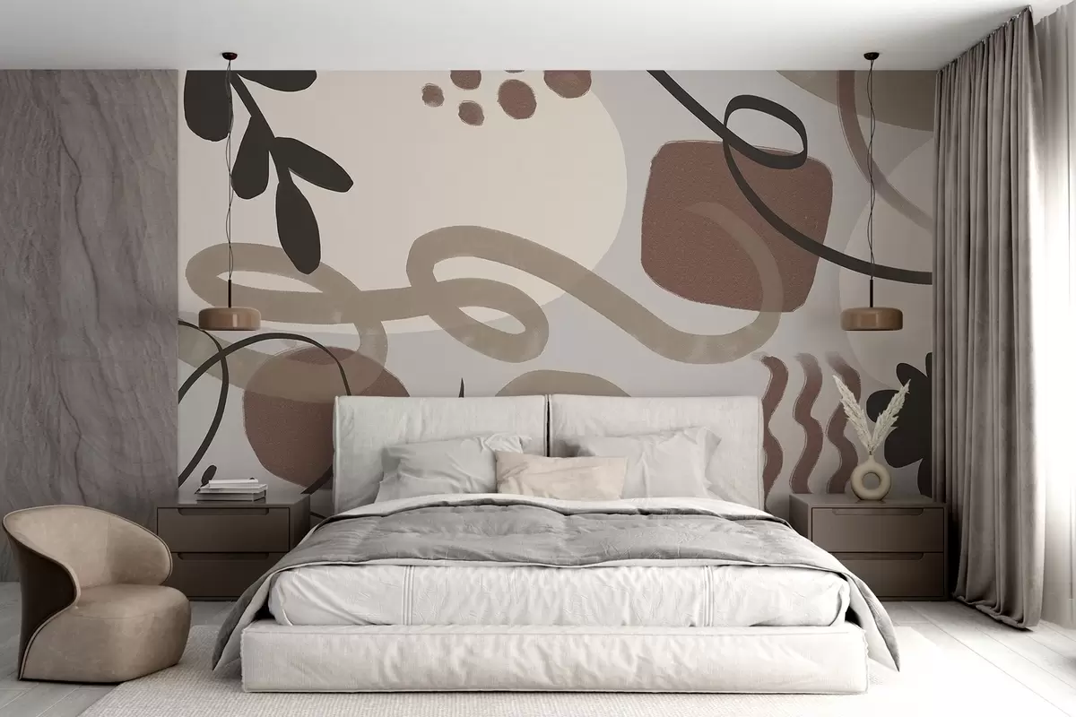 Stenske poslikave Abstraktni teksturirani minimalistični sodobni tisk z oblikami v zemeljskih tonih rjave, bež in črne barve Št. w08384
