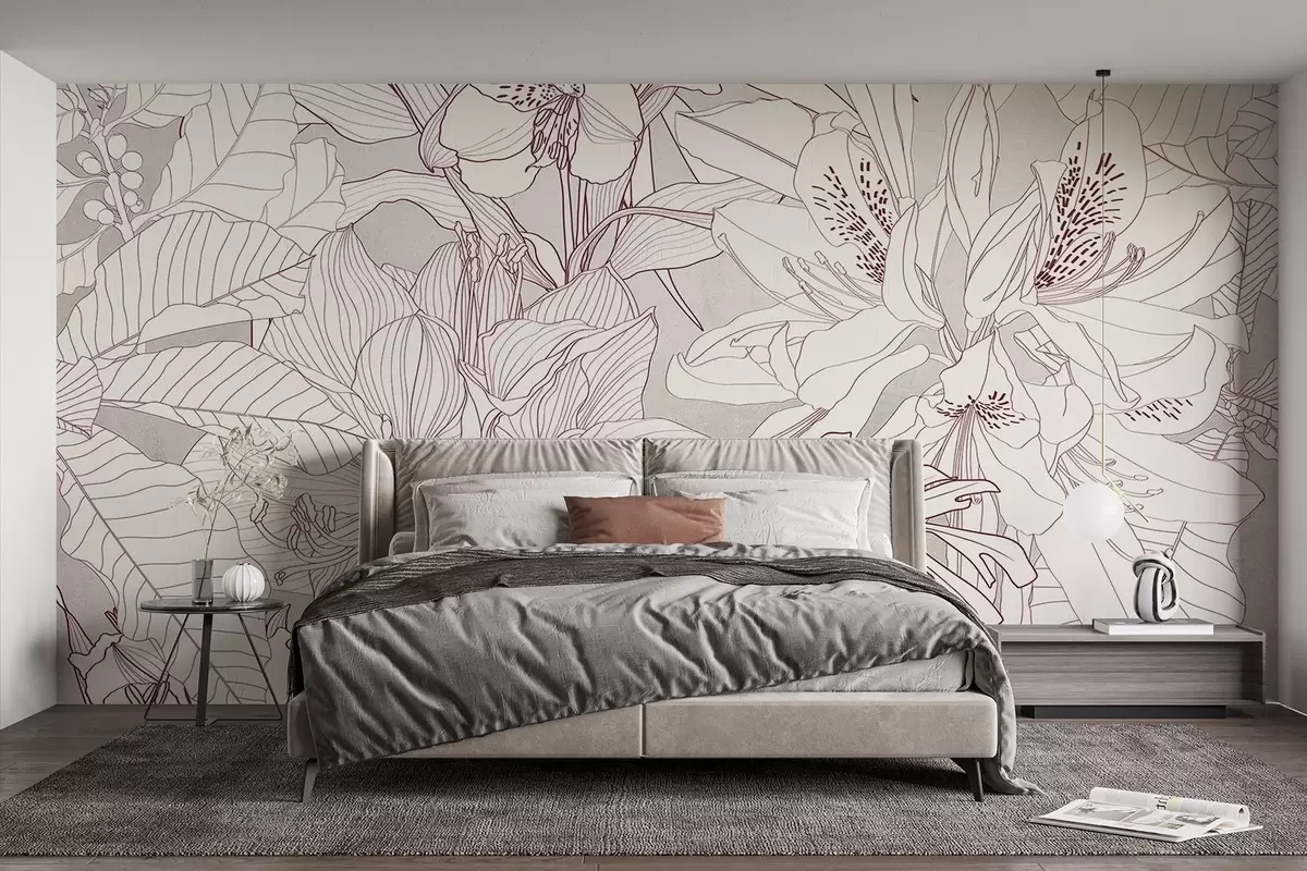 Stenske poslikave Podroben bordo in siv cvetlični potisk z različnimi vrstami cvetja in listov, bujno, zapleteno botanično oblikovanje Št. w08385