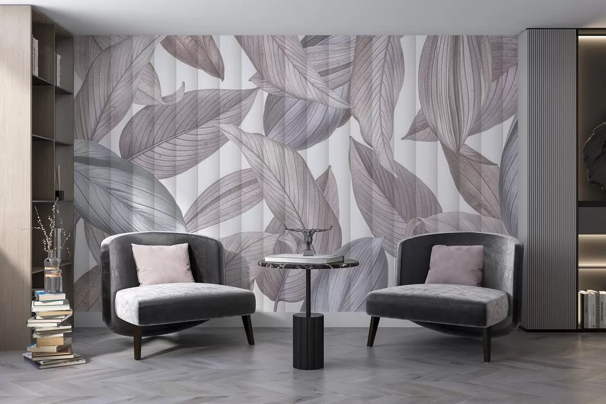Stenske poslikave Abstraktni podrobni listi v odtenkih modre, sive in pastelno rožnate barve na svetlem ozadju Št. w08388v1