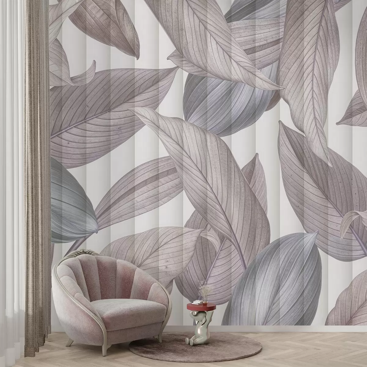 Stenske poslikave Abstraktni podrobni listi v odtenkih modre, sive in pastelno rožnate barve na svetlem ozadju Št. w08388v1