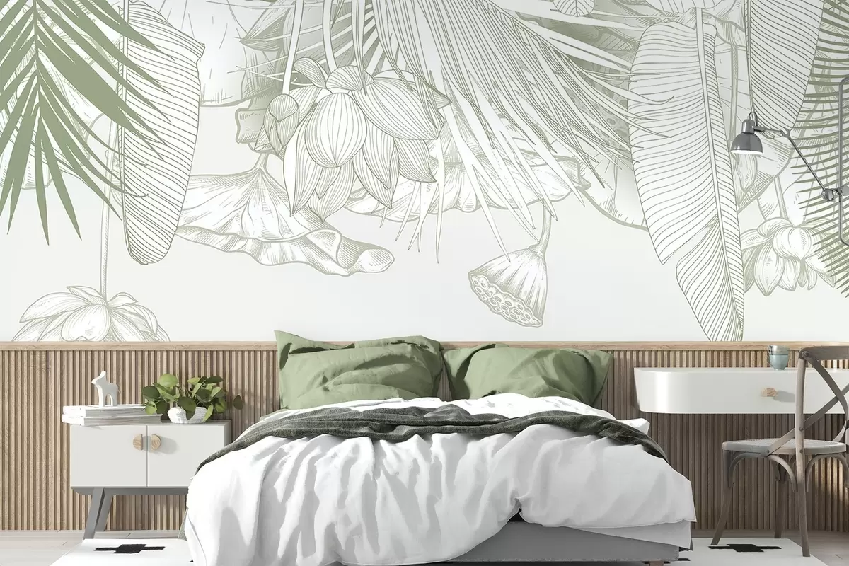 Stenske poslikave Pogled od blizu na zeleni cvetlični potisk z velikimi, prekrivajočimi se cvetnimi listi in listi v enobarvni barvi Št. w08389v1