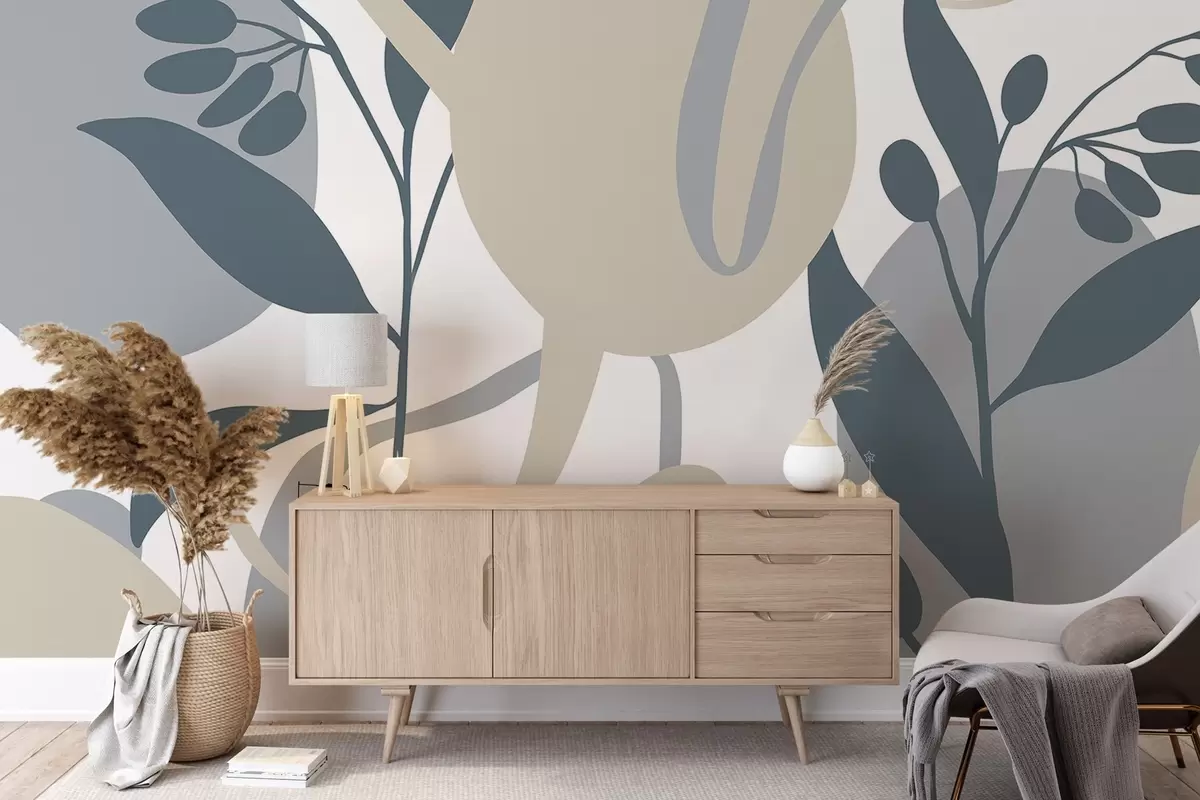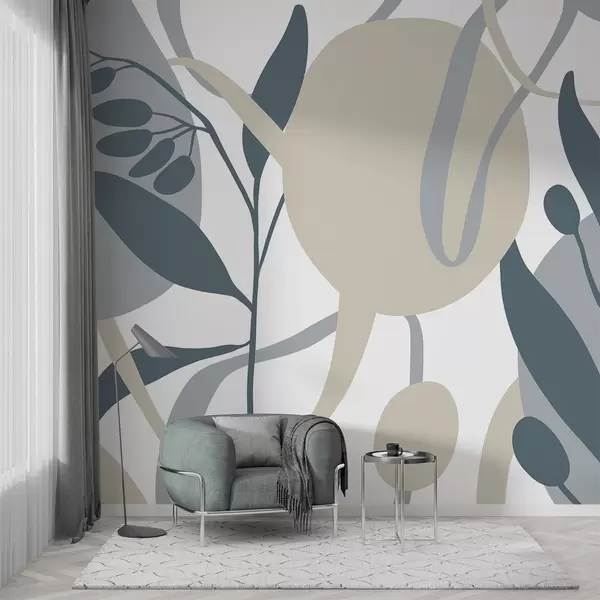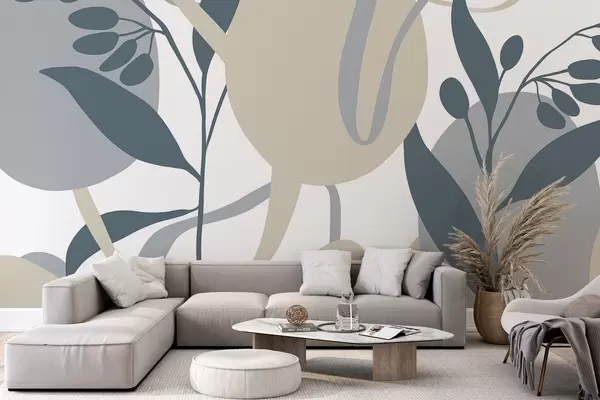 Stenske poslikave Minimalistični abstraktni cvetlični tisk z bež in sivimi oblikami na belem ozadju Št. w08400