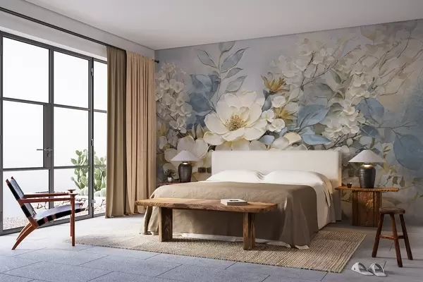 Stenske poslikave Teksturirani veliki beli in bledo rumeni cvetovi s sivo-zelenimi listi na mehkem, zamegljenem ozadju Št. w08404