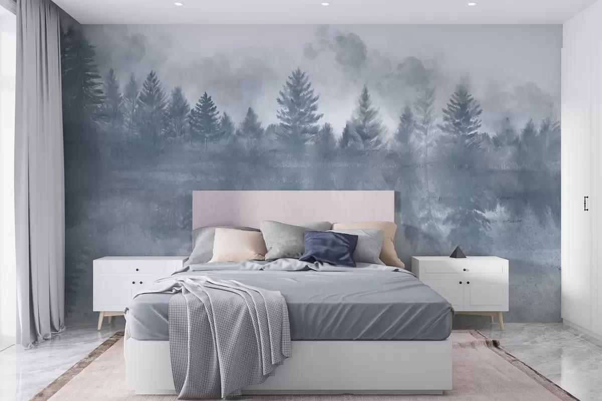 Stenske poslikave Mirna pokrajina z zamrznjenim jezerom, ki ga obdaja gost borov gozd, z meglenim, meglenim vzdušjem Št. w08415