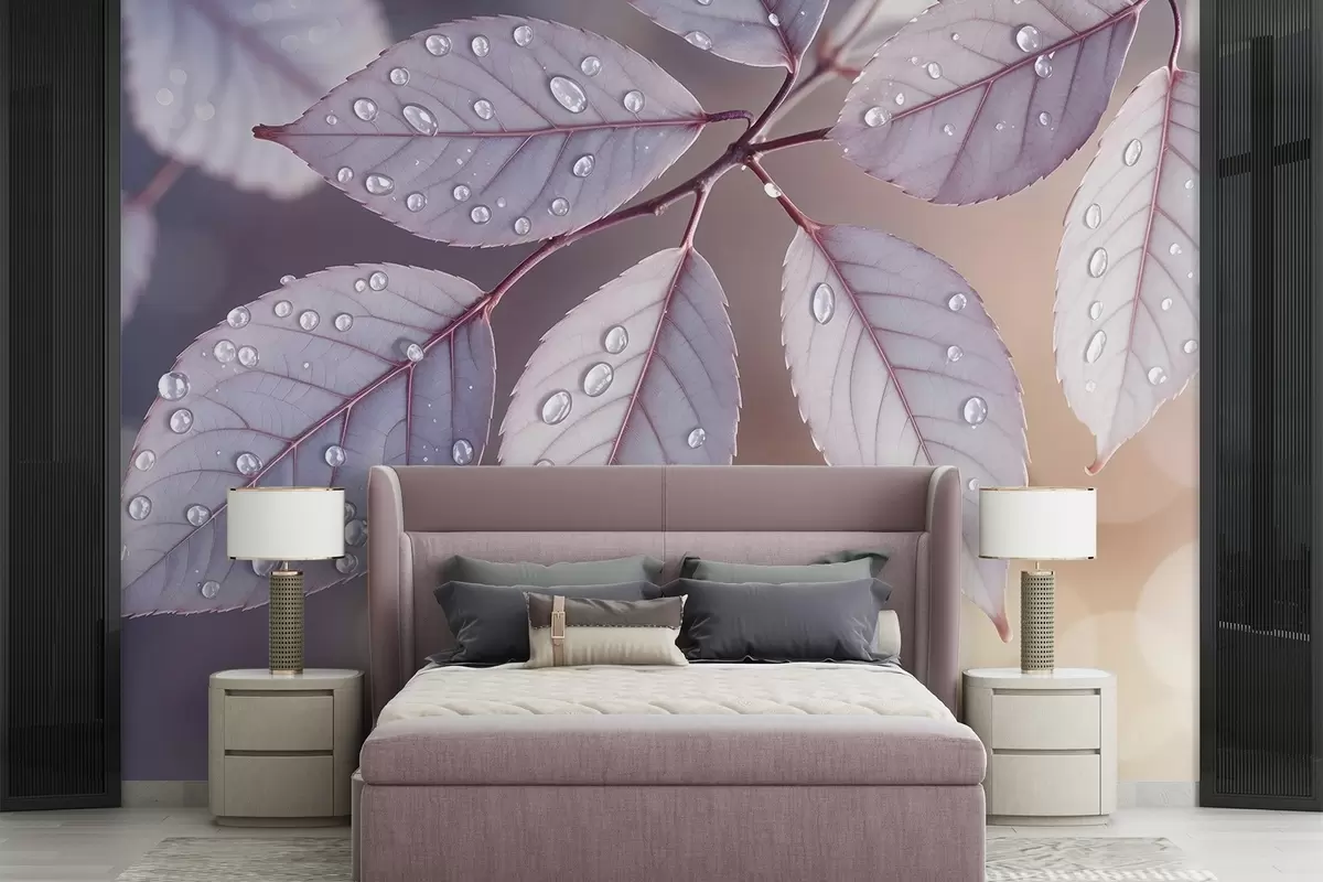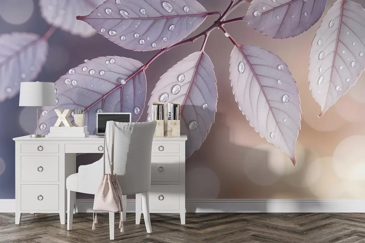 Stenske poslikave Nežni vijolični listi z vodnimi kapljicami, mehko ozadje Št. w08419