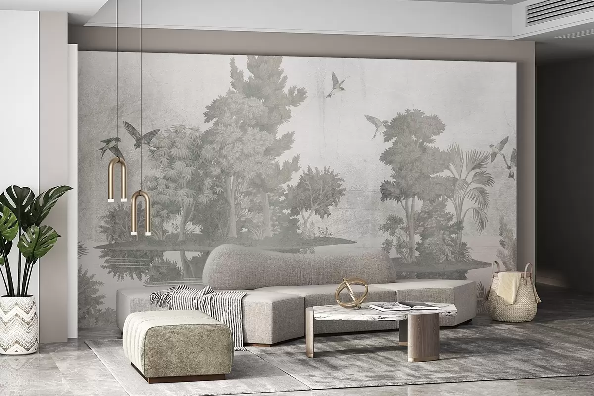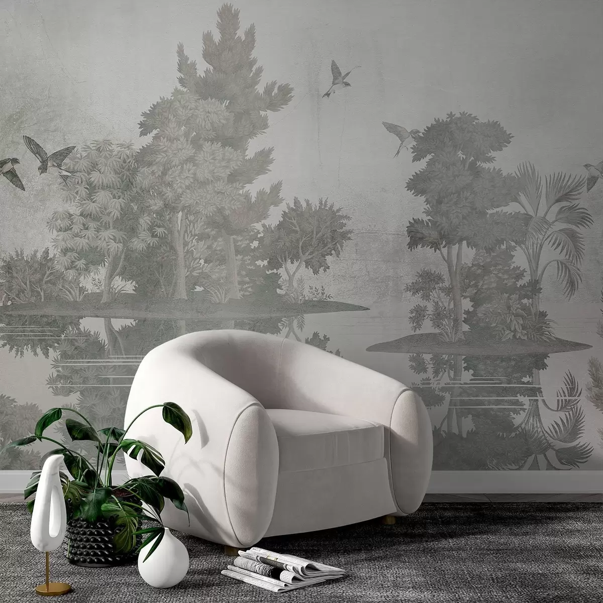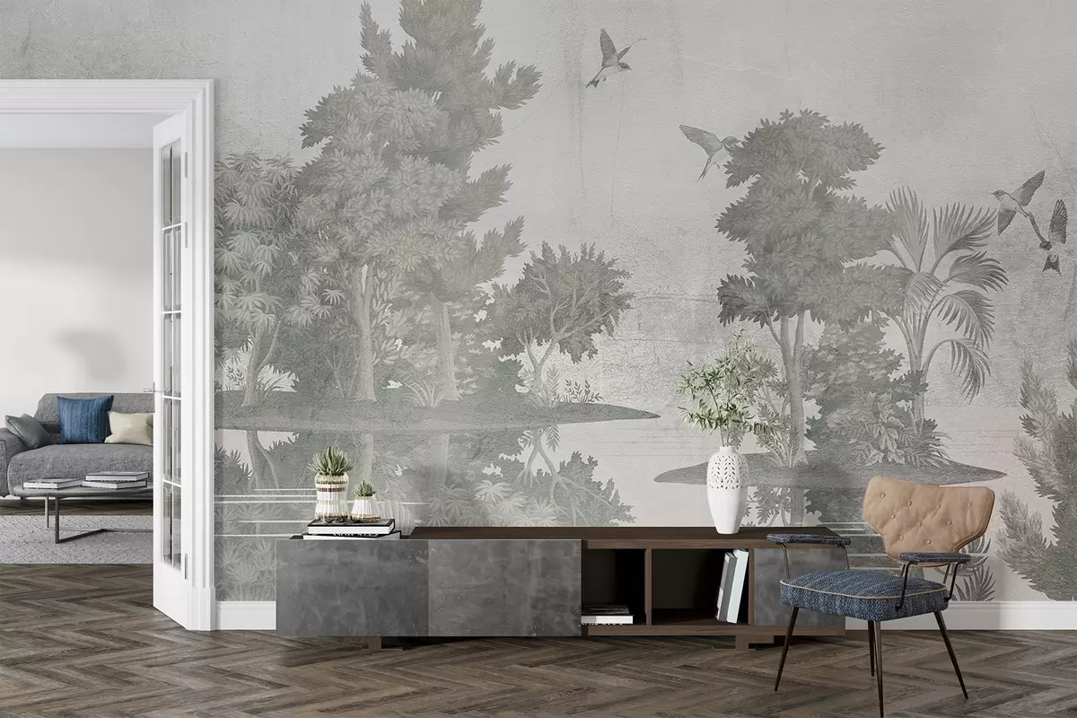 Stenske poslikave Tisk gozdne pokrajine z jezerom, obkroženim z borovci in drugim listjem na teksturiranem zelenem ozadju Št. w08426v1