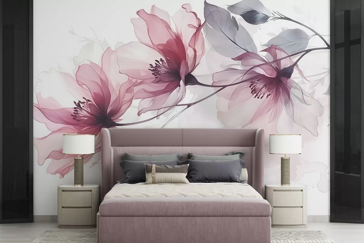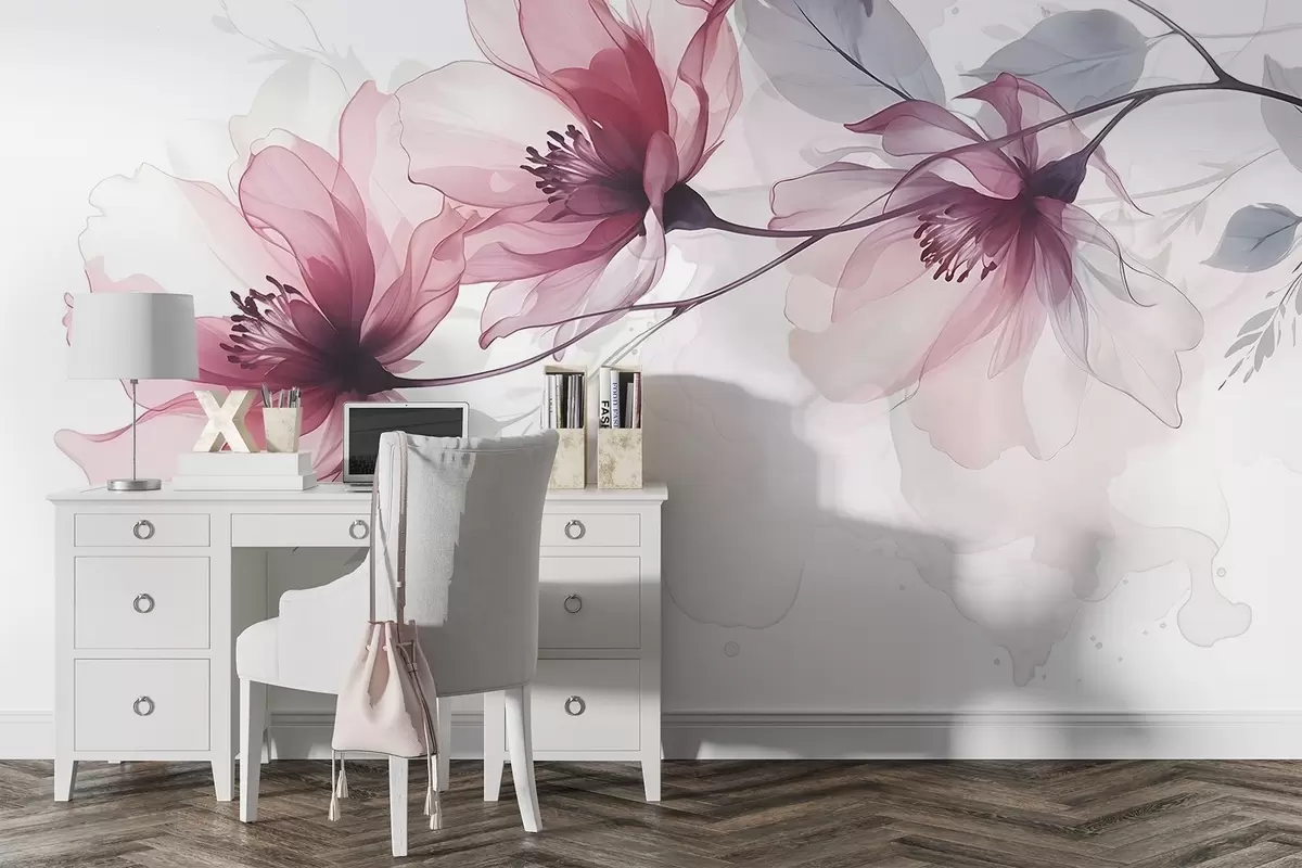 Stenske poslikave Nežno prozorno rožnato in sivo cvetje z mehkimi, zamegljenimi cvetnimi listi na belem ozadju Št. w08429