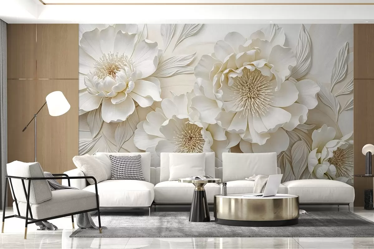 Stenske poslikave Elegantna voluminozna imitacija belih pivonik z mehkimi cvetnimi lističi in pastelno rumenimi središči na svetlem ozadju Št. w08431