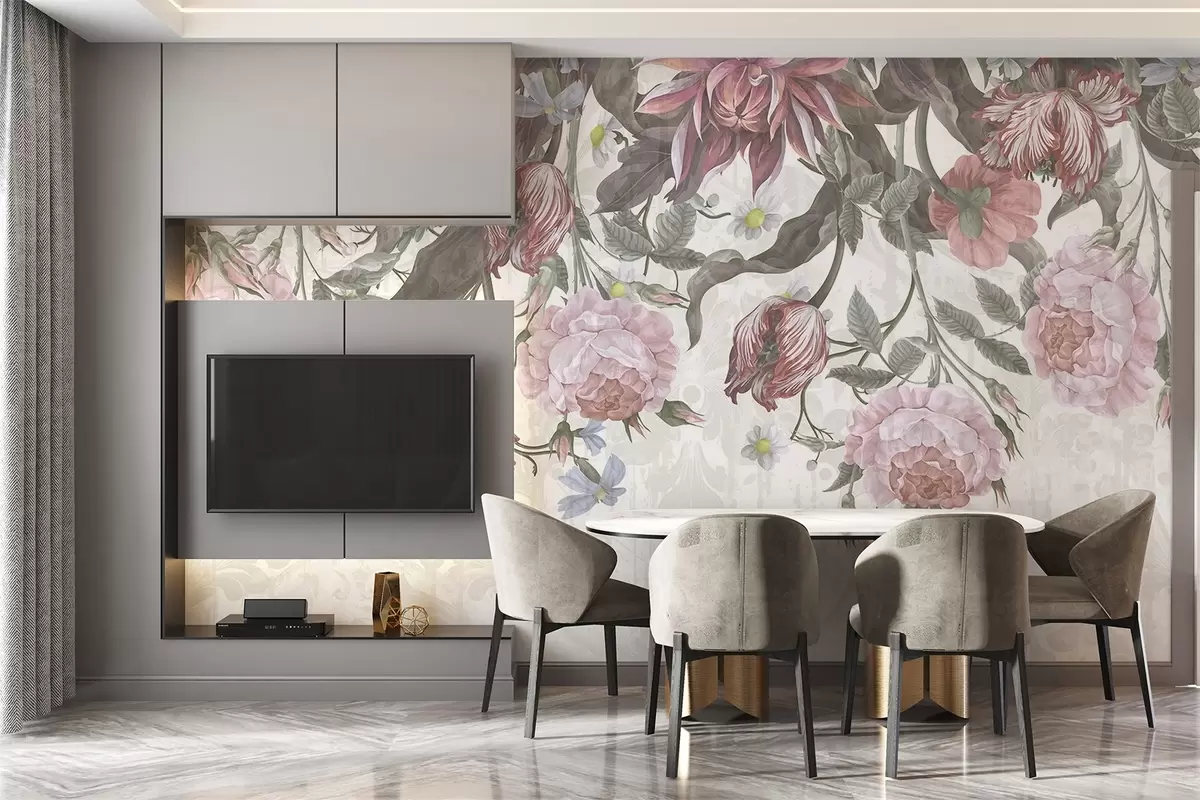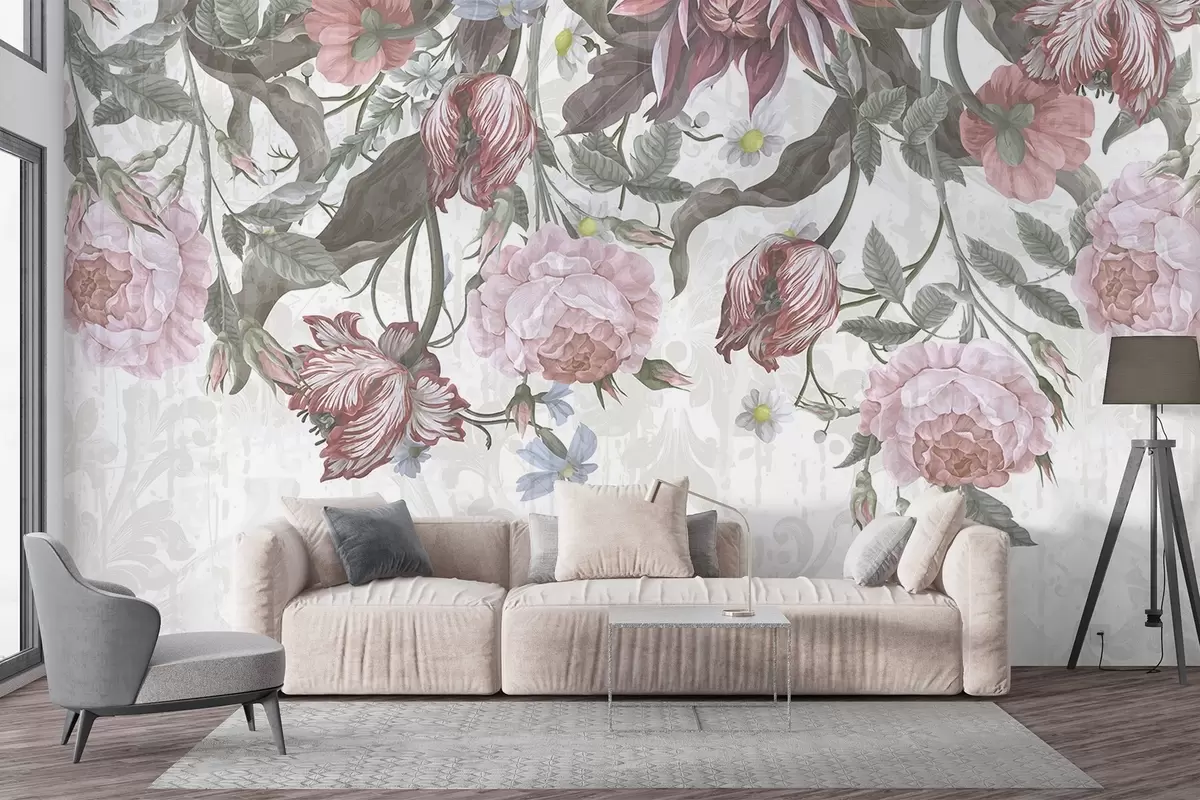 Stenske poslikave Bujen cvetlični aranžma z velikimi rožnatimi in belimi cvetovi z zelenimi listi in stebli Št. w08435