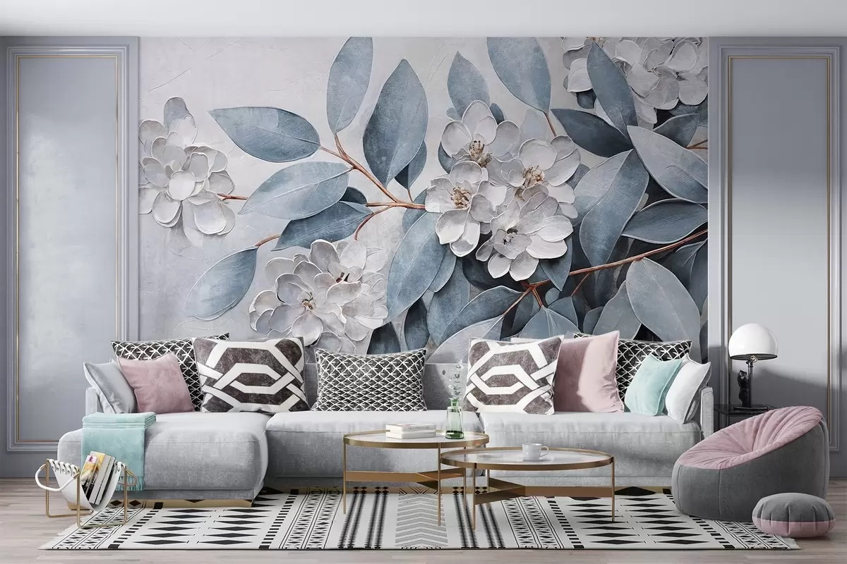 Stenske poslikave Nežno belo cvetje s sivo-zelenimi listi na mehkem, utišanem ozadju v slogu oljnega slikarstva Št. w08437