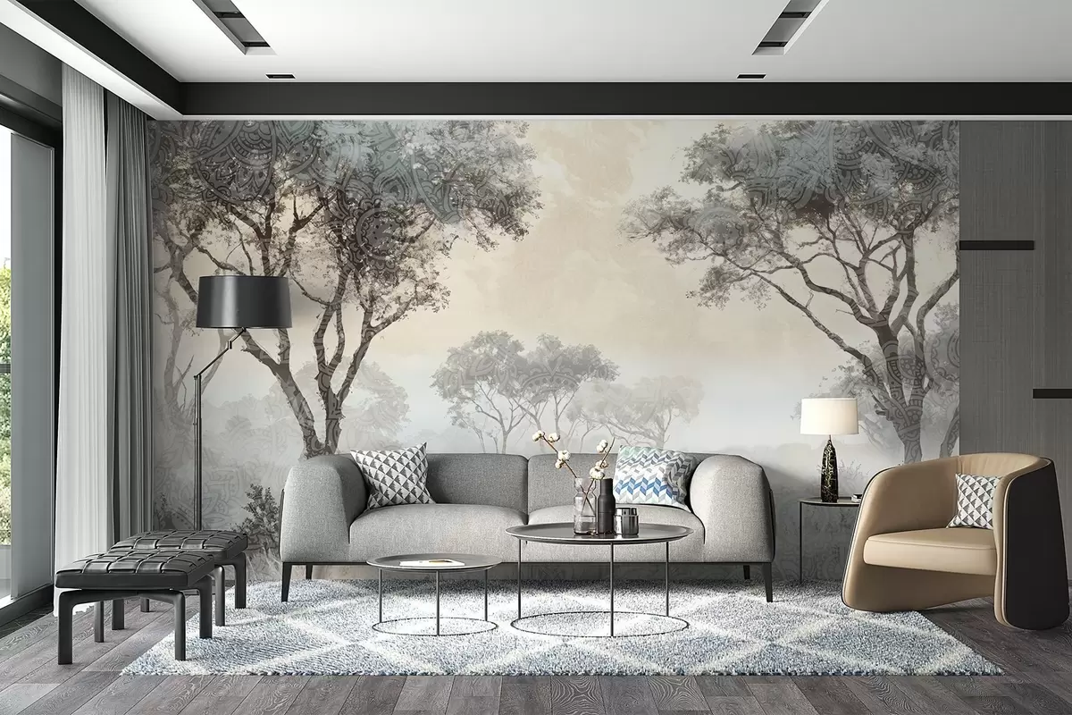 Stenske poslikave Meglena, mirna pokrajina s silhuetami dreves v ospredju z mehko meglo v sivih in bež odtenkih Št. w08442v1