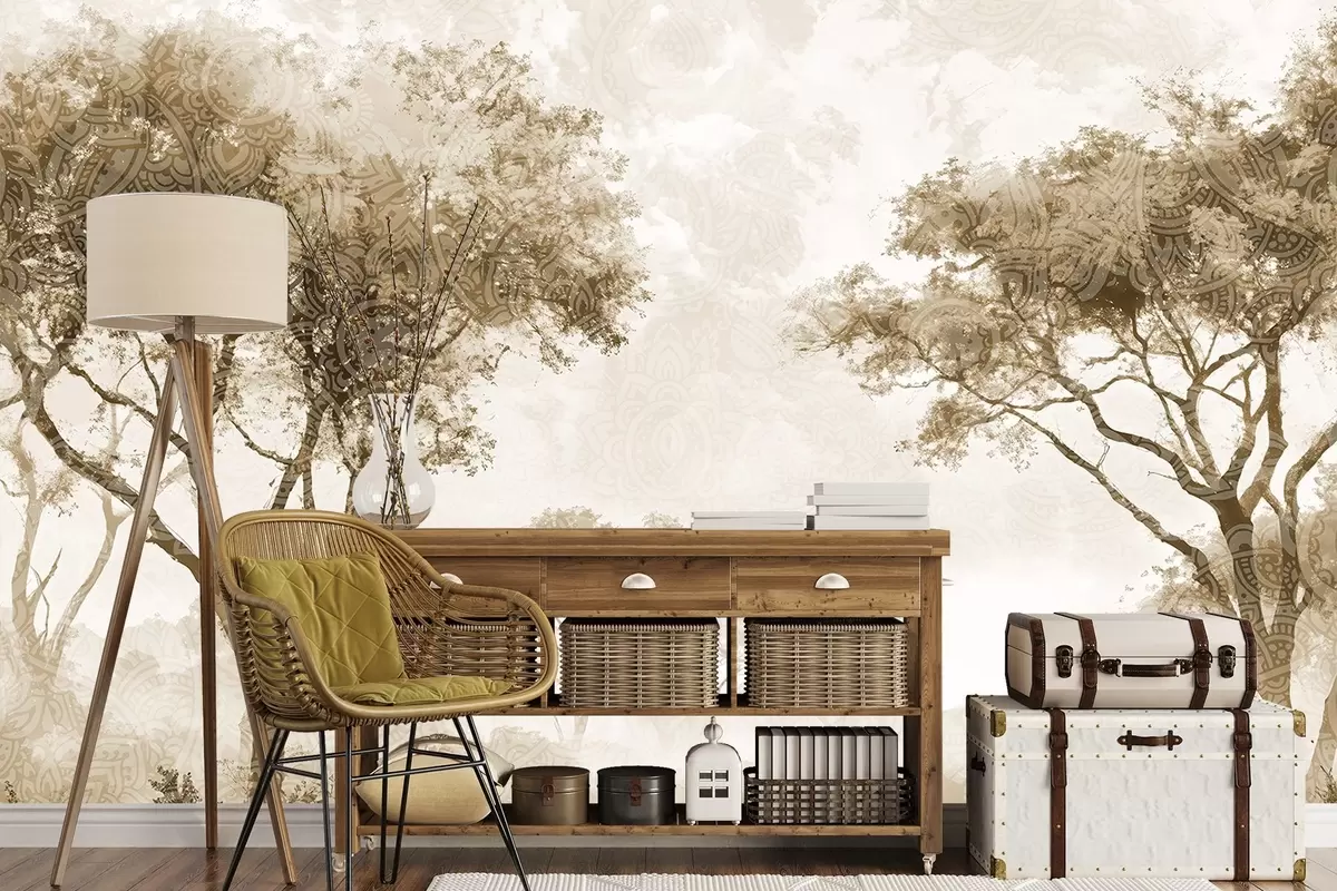 Stenske poslikave Meglena, mirna pokrajina s silhuetami dreves v ospredju z mehko meglo v rjavih in bež odtenkih Št. w08442v2