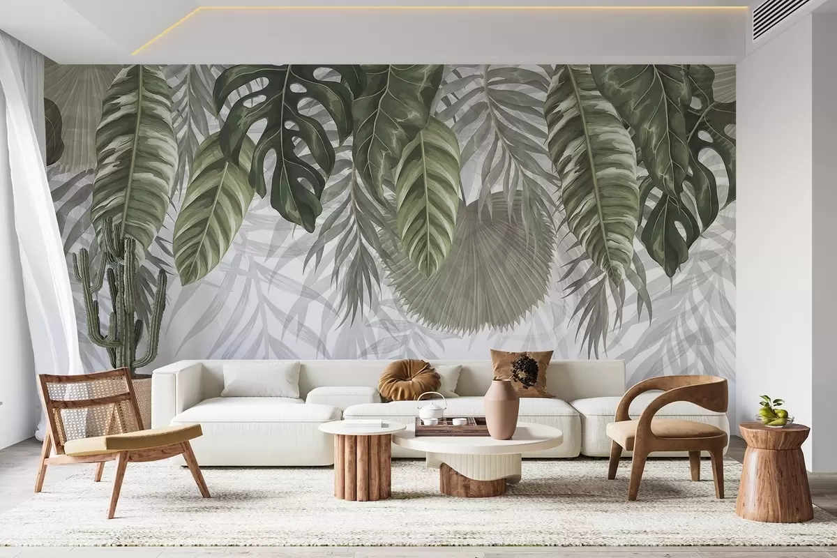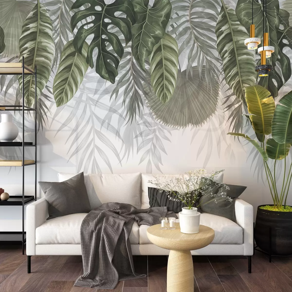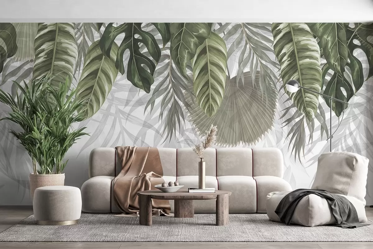 Stenske poslikave Tropski listi v zelenih odtenkih, vključno z velikimi listi monstere in palmovimi listi na belem ozadju Št. w08443