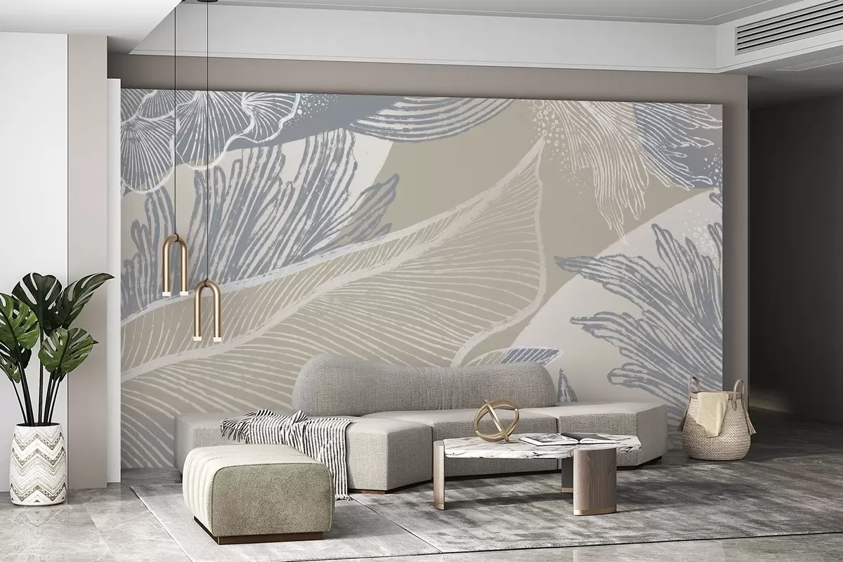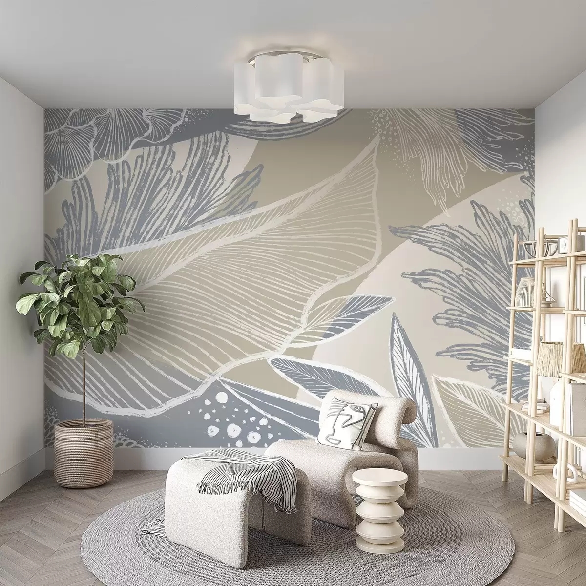 Stenske poslikave Pastelno modro-bel abstraktni tisk z organskimi oblikami in linijami z umirjeno barvno paleto Št. w08450