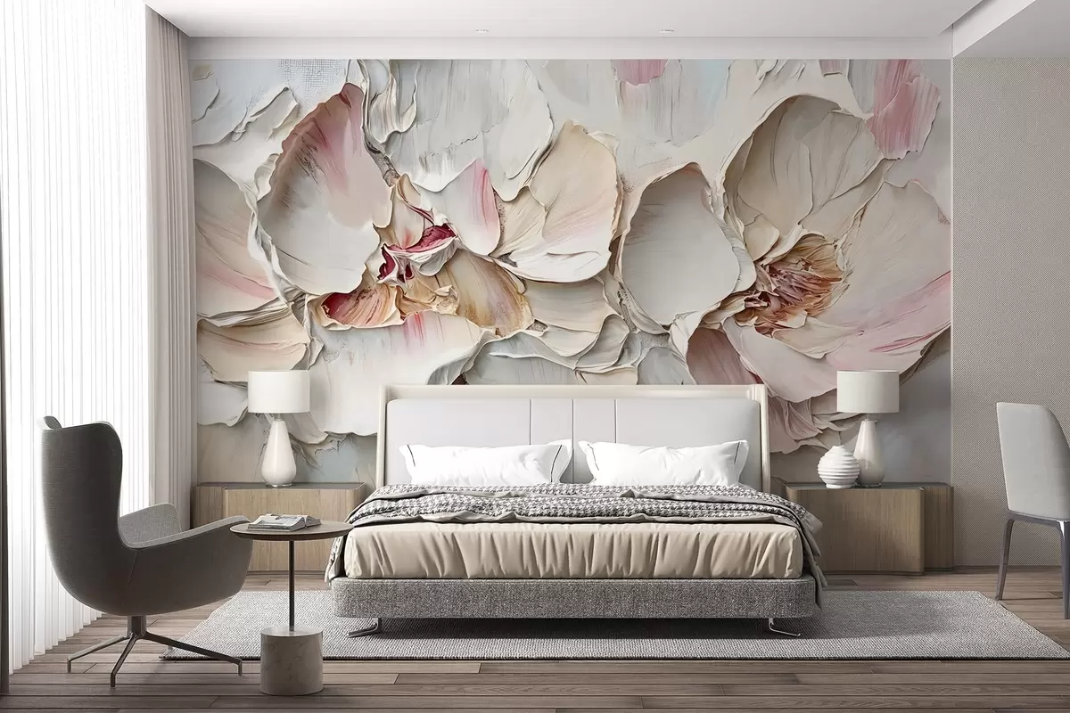 Stenske poslikave Nežno, bledo rožnato cvetje z mehkimi, večplastnimi cvetnimi listi na utišanem, teksturiranem ozadju impasto imitacija oljnega slikarstva Št. w08467