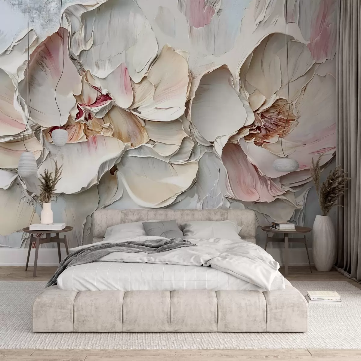 Stenske poslikave Nežno, bledo rožnato cvetje z mehkimi, večplastnimi cvetnimi listi na utišanem, teksturiranem ozadju impasto imitacija oljnega slikarstva Št. w08467