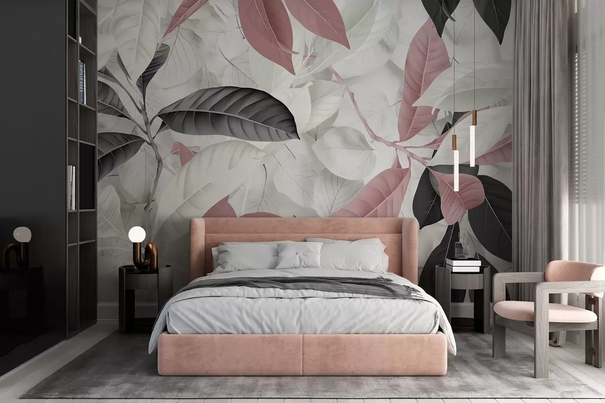 Stenske poslikave Velik tisk rožnatih in sivih listov na ozadju s teksturo svetlih listov, ki ustvarja bujno tropsko vzdušje Št. w08468