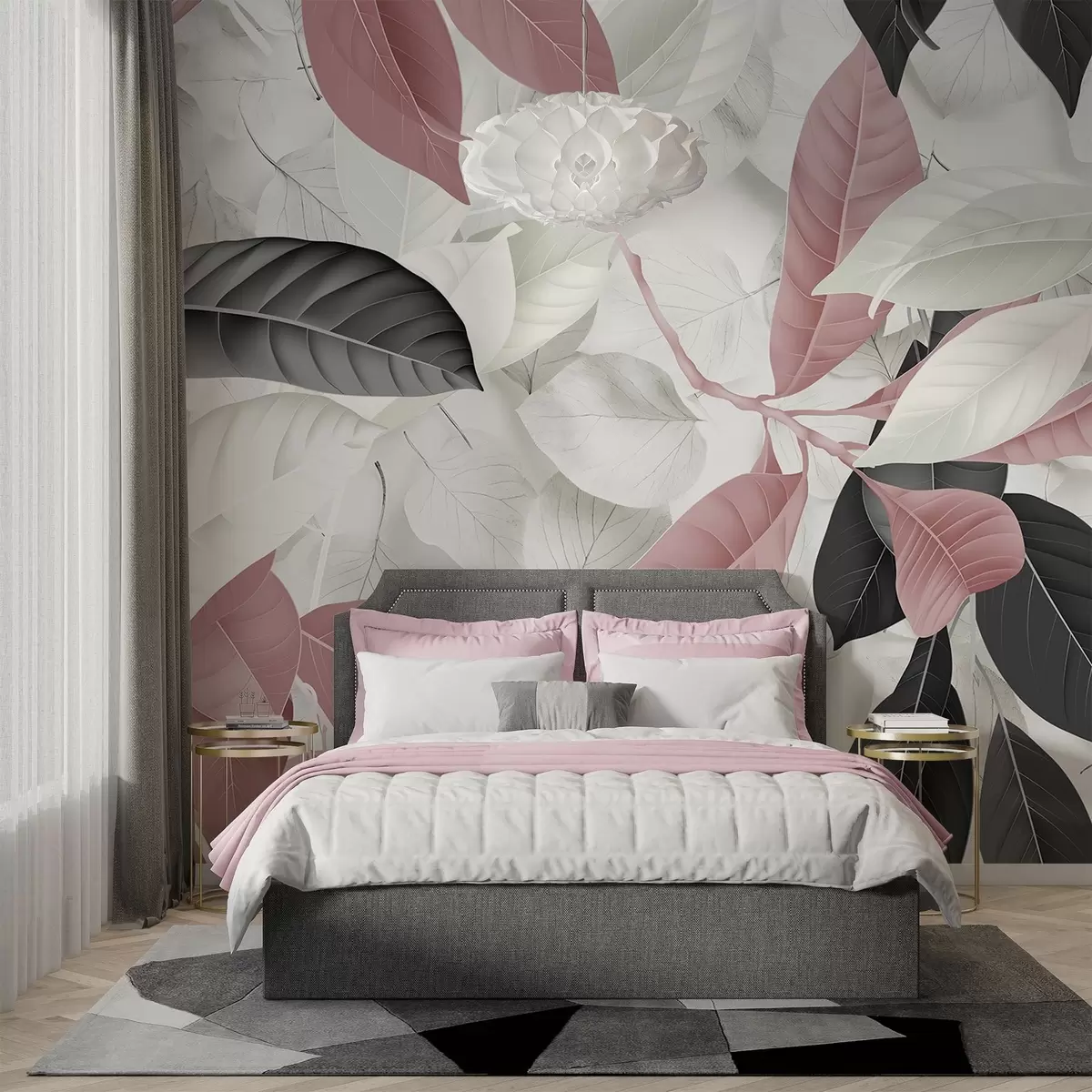 Stenske poslikave Velik tisk rožnatih in sivih listov na ozadju s teksturo svetlih listov, ki ustvarja bujno tropsko vzdušje Št. w08468