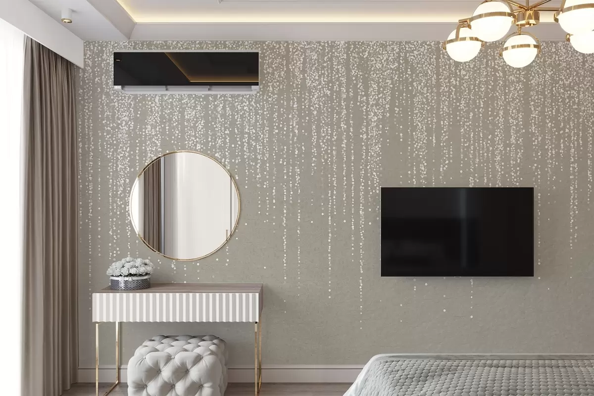 Stenske poslikave Navpični elegantni tisk pikčastega venca na bež teksturiranem ozadju, ki ustvarja občutek globine in gibanja Št. w08470