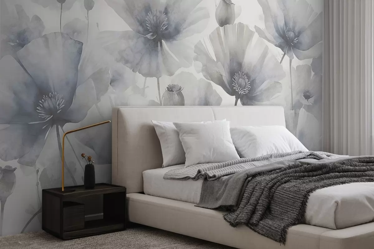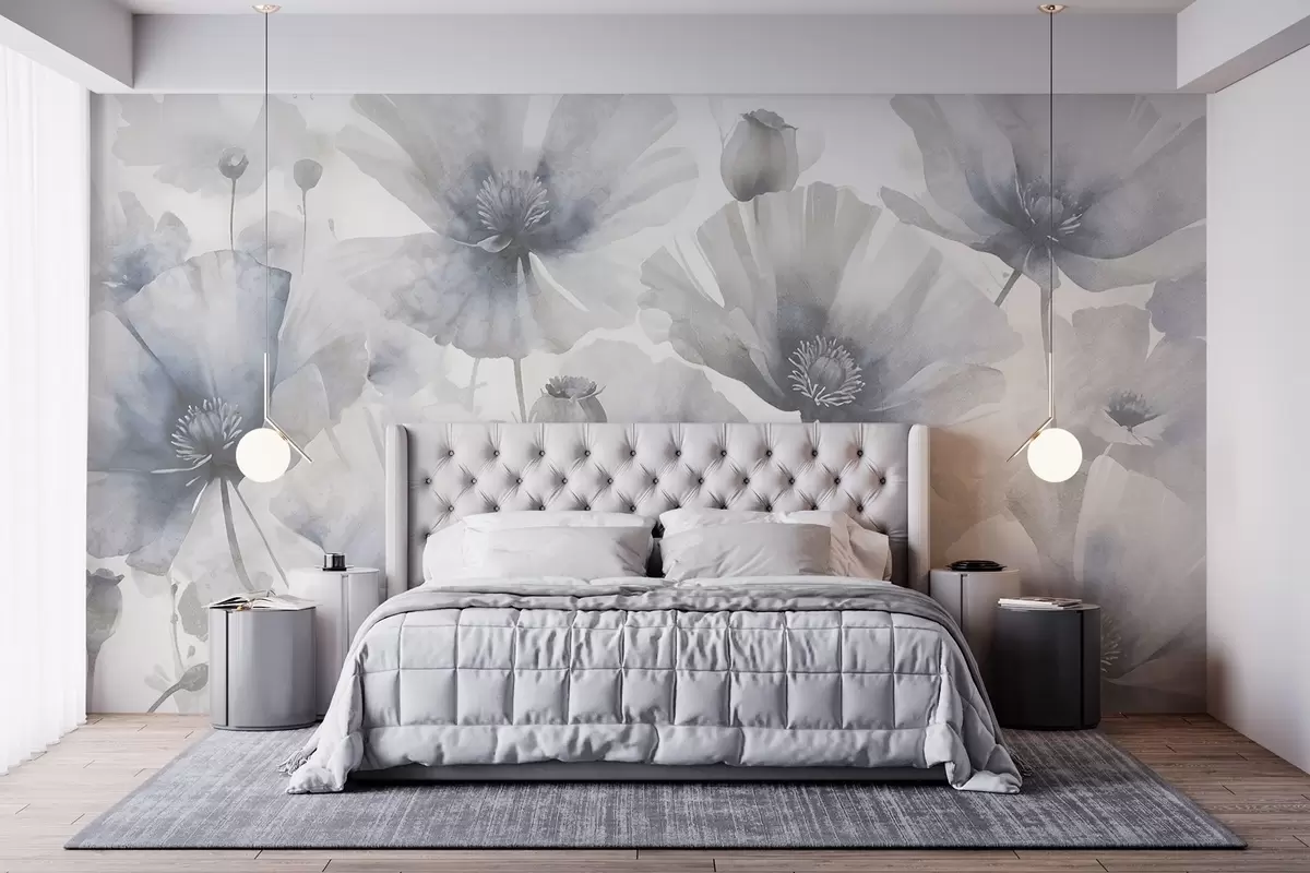 Stenske poslikave Nežno teksturno grunge sivo in belo cvetje z mehkimi, zamegljenimi cvetnimi listi na belem ozadju Št. w08526